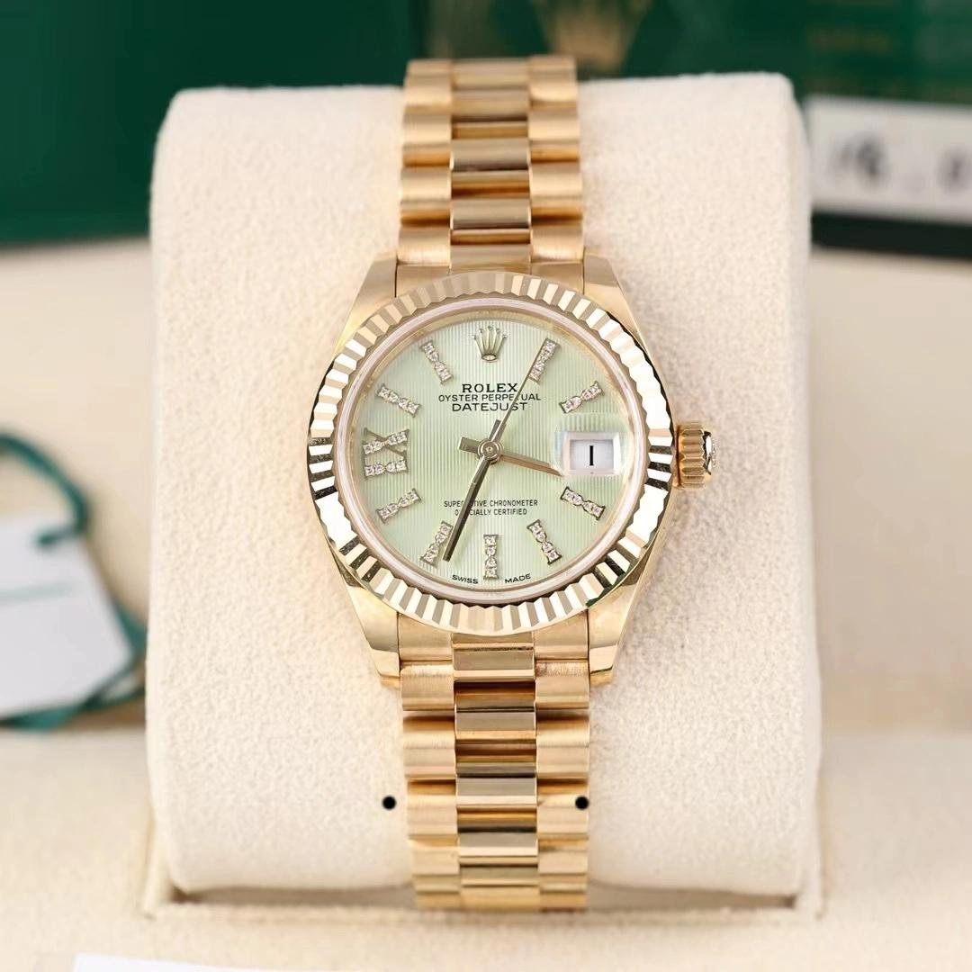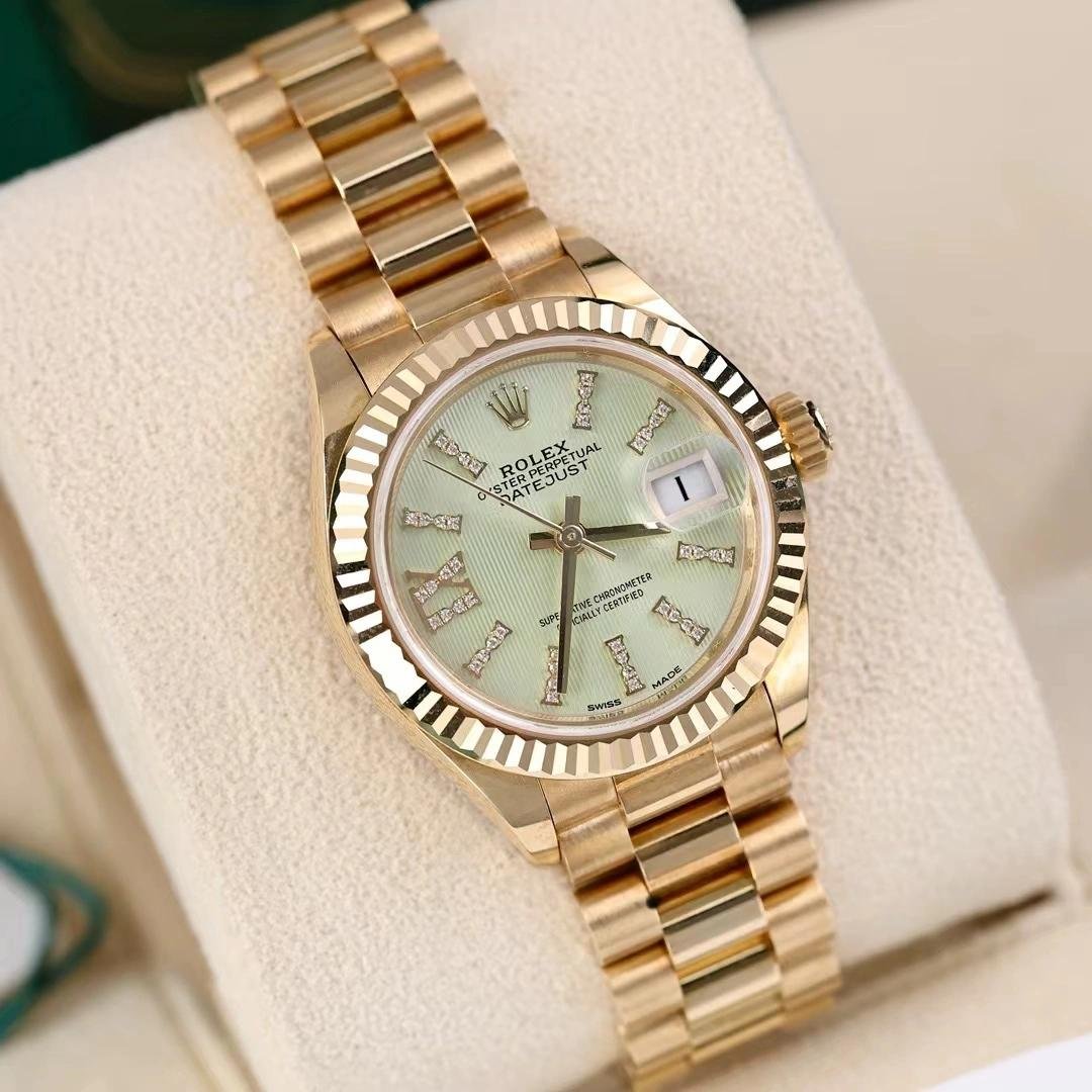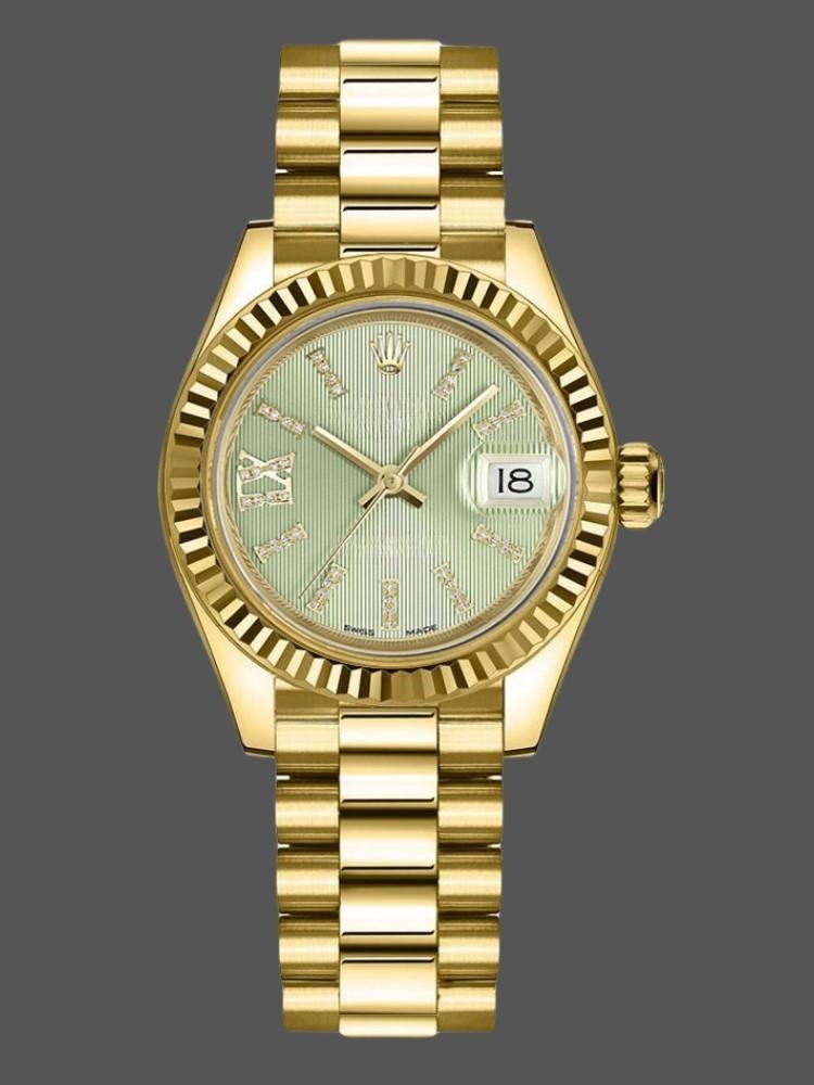 Rolex Datejust 279178 Women’s Watch, Linden Green Dial, Fluted Bezel, 28mm, 28mm Yellow Gold Round Case with Screw-On Crown and Fluted Bezel yellow gold. Linden green dial with diamond indexes. Roman numeral IX with diamonds at 9. Yellow gold President bracelet with three-piece semicircular links and hidden Crownclasp folding clasp.