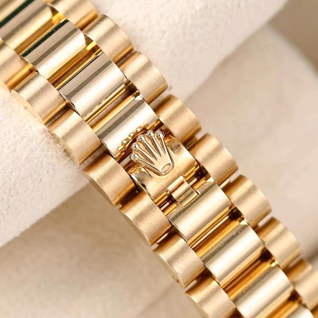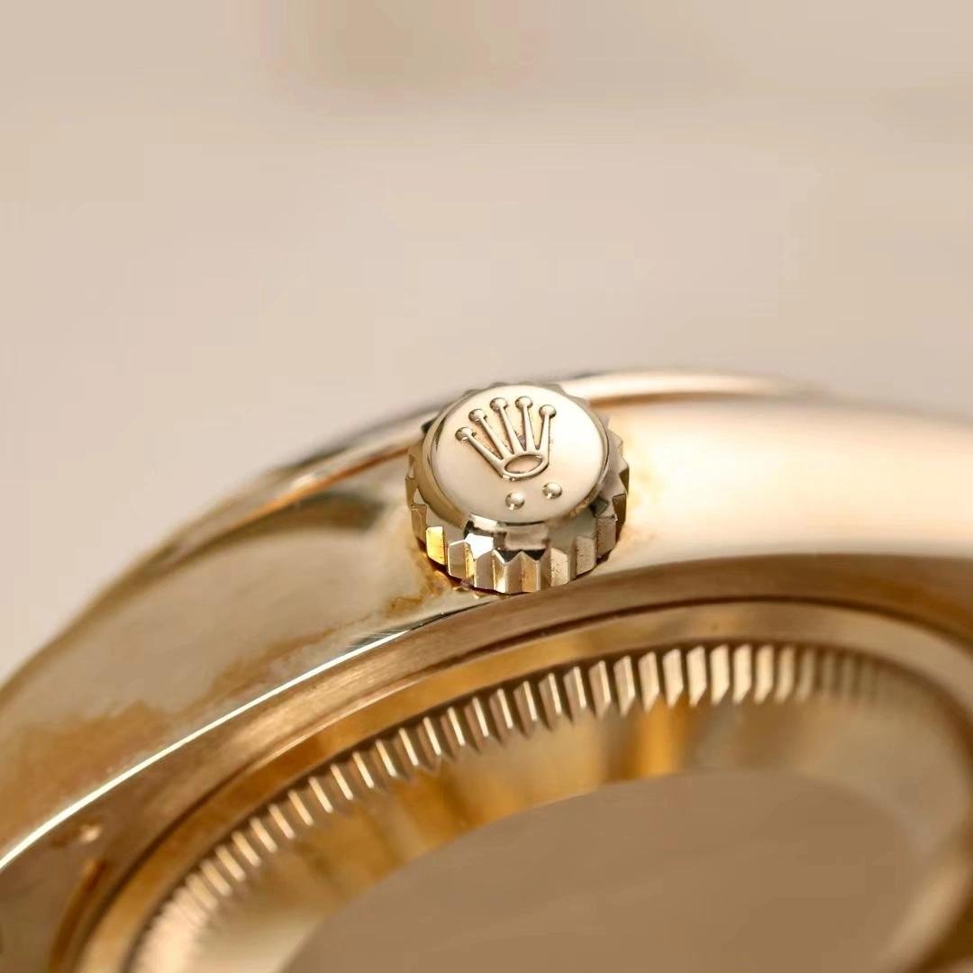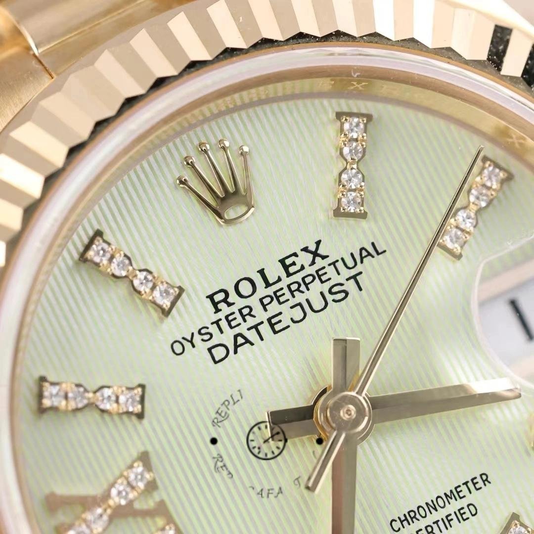 Rolex Datejust 279178 Women’s Watch, Linden Green Dial, Fluted Bezel, 28mm, 28mm Yellow Gold Round Case with Screw-On Crown and Fluted Bezel yellow gold. Linden green dial with diamond indexes. Roman numeral IX with diamonds at 9. Yellow gold President bracelet with three-piece semicircular links and hidden Crownclasp folding clasp.