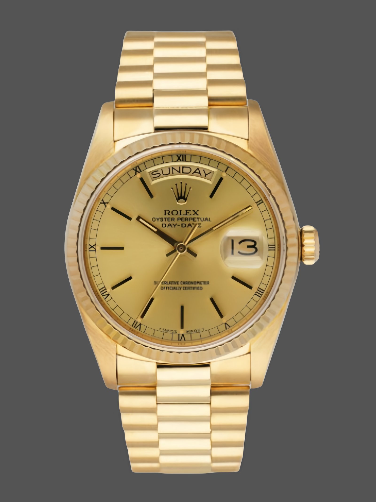 Rolex Day-Date 118208, champagne dial with gold indexes, 36mm yellow gold unisex replica watch. 36mm yellow gold case with yellow gold Rolex President bracelet. Fixed yellow gold domed bezel. Champagne dial with gold indexes. Minute markers around the outer edge. Date display at 3 o’clock. Day of the week display focused on the 12 o’clock position. Scratch resistant sapphire crystal. Screw-down crown. Solid caseback. Round box.