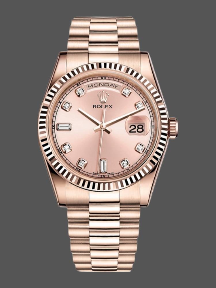 Rolex Day-Date 118235 replica watch for women with 36 mm pink diamond dial. 36mm diameter rose gold Oyster case. Rose gold fluted bezel. Scratch resistant sapphire crystal with Cyclops magnifying glass. Pink dial with diamond indexes. Calendar with date on the window at 3. Day window at 12. Rose gold Oyster bracelet with hidden clasp. Fits 18cm wrists.