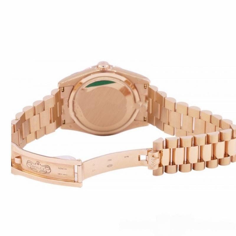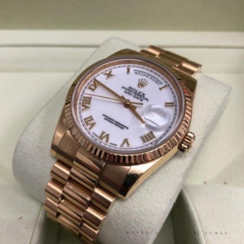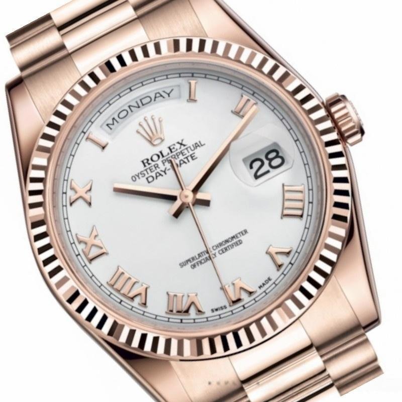 The Rolex Day-Date 118235, unisex watch with white dial and 36mm fluted bezel, 36mm round rose gold case, screw-down crown and rose gold fluted bezel. White dial with rose gold Roman numeral markers and hands. The day at 12 and the date at 3. Rose gold President bracelet with thick strap folding crown closure.