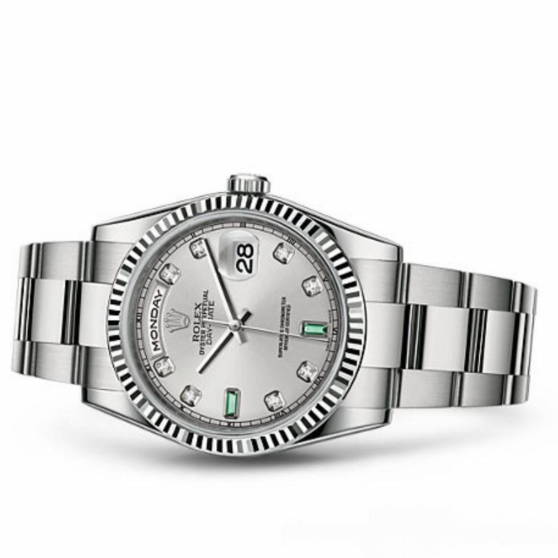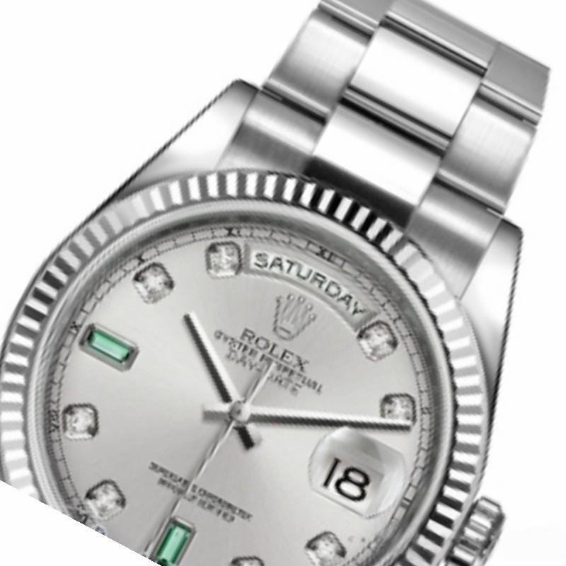 Unisex Rolex Day-Date 118239 replica watch, rhodium gray dial, white gold, 36 mm. 36mm white gold case with white gold Rolex Oyster bracelet. White gold ribbed fixed bezel. Rhodium-plated gray dial with a fun sunray effect finish. 8 round diamonds and 2 baguette-cut emerald hour markers. Polished white gold hands. Day of the week window at 12. Date window at 3 o’clock with cyclops magnifying glass. Scratch resistant sapphire crystal. Screw-down crown.