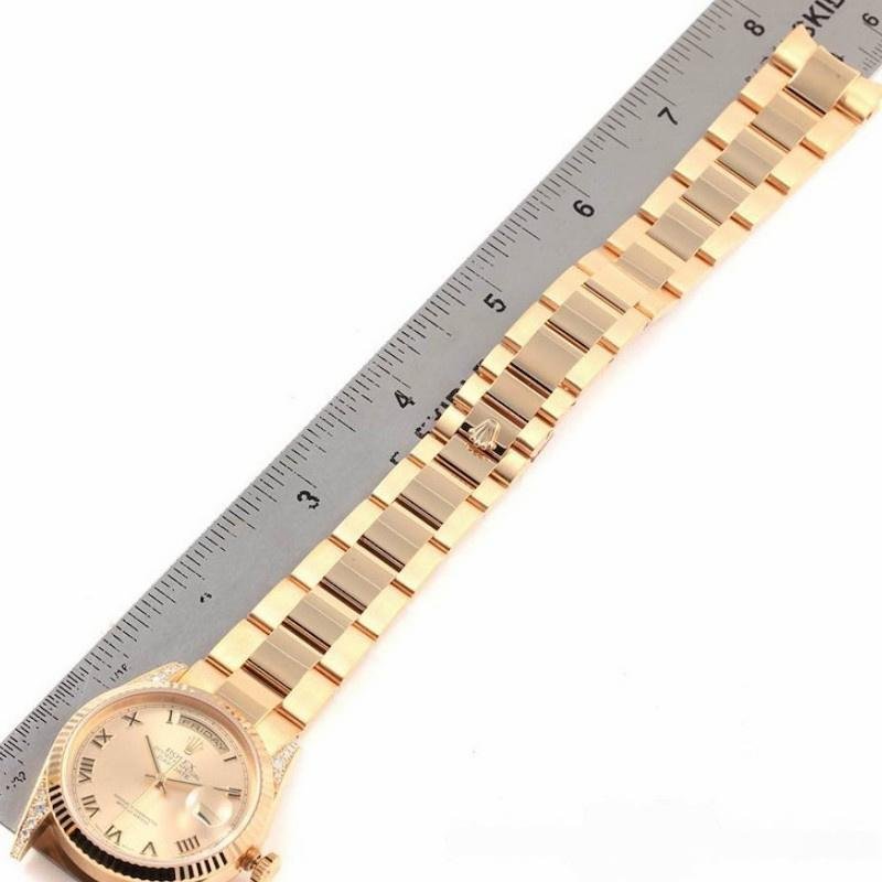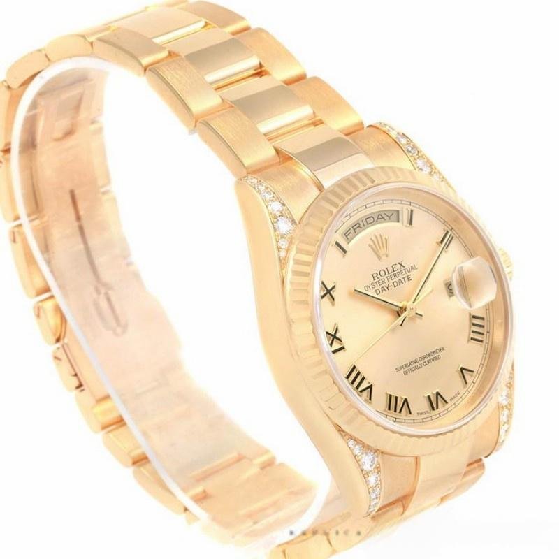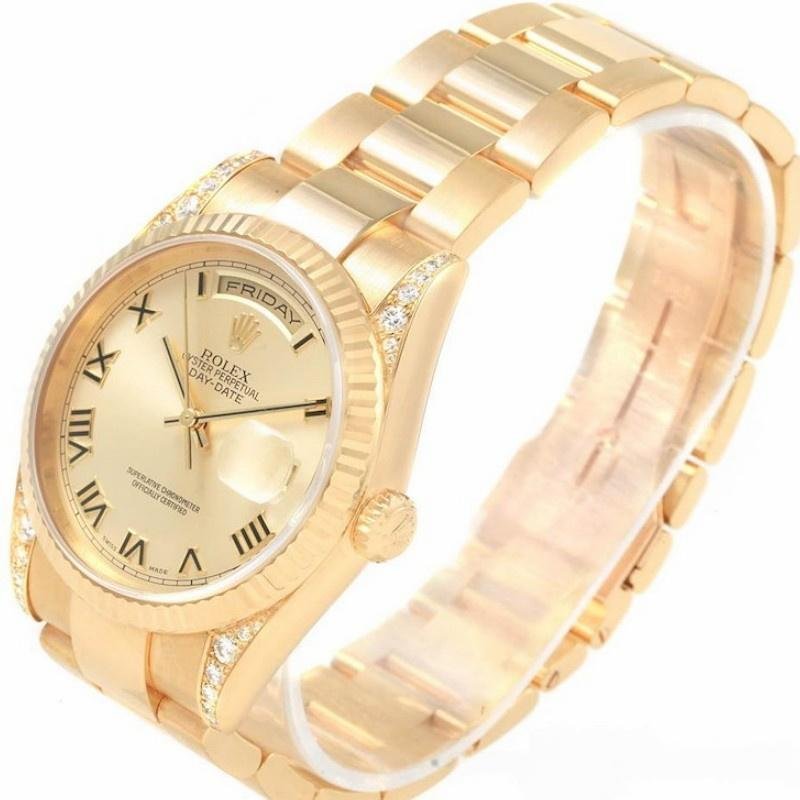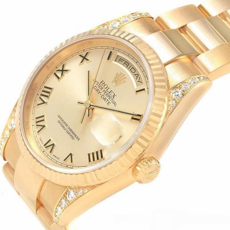 The Rolex Day-Date 118338, unisex yellow gold replica, champagne dial, Roman numerals, 36mm, features a 36mm yellow gold case and a scratch-resistant sapphire crystal with a solid screw-down crown. Round diamonds set on the handles add a touch of luxury. The yellow gold ribbed bezel gives it a touch of elegance. The champagne dial with embossed gold Roman numerals, the day of the week window at 12 and the date window at 3 are champagne colored. The luxurious case features a yellow gold President bracelet with hidden folding crown clasp.