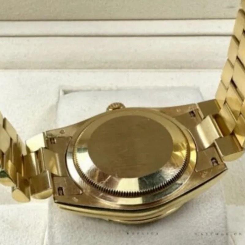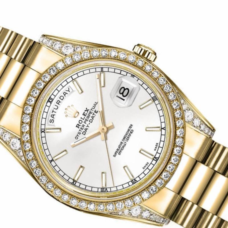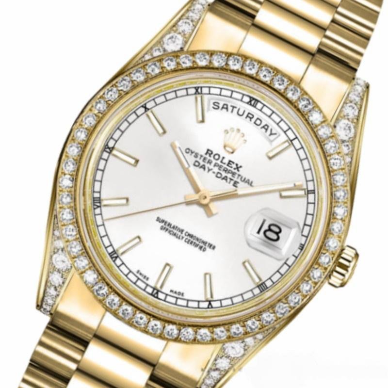 The Rolex Day-Date 118388, unisex replica with diamond bezel and 36mm white dial, features a 36mm yellow gold case set with diamonds, white dial with indexes, diamond-encrusted handles, matching diamond bezel, hour and minute hands, and scratch-resistant sapphire crystal with Cyclops magnifying glass. Day of the week window at 12. Date window at 3. Its elegant design with hidden folding crown closure will give a touch of class to your wrist.