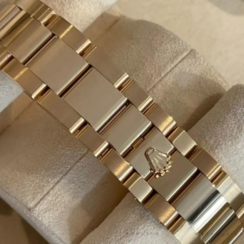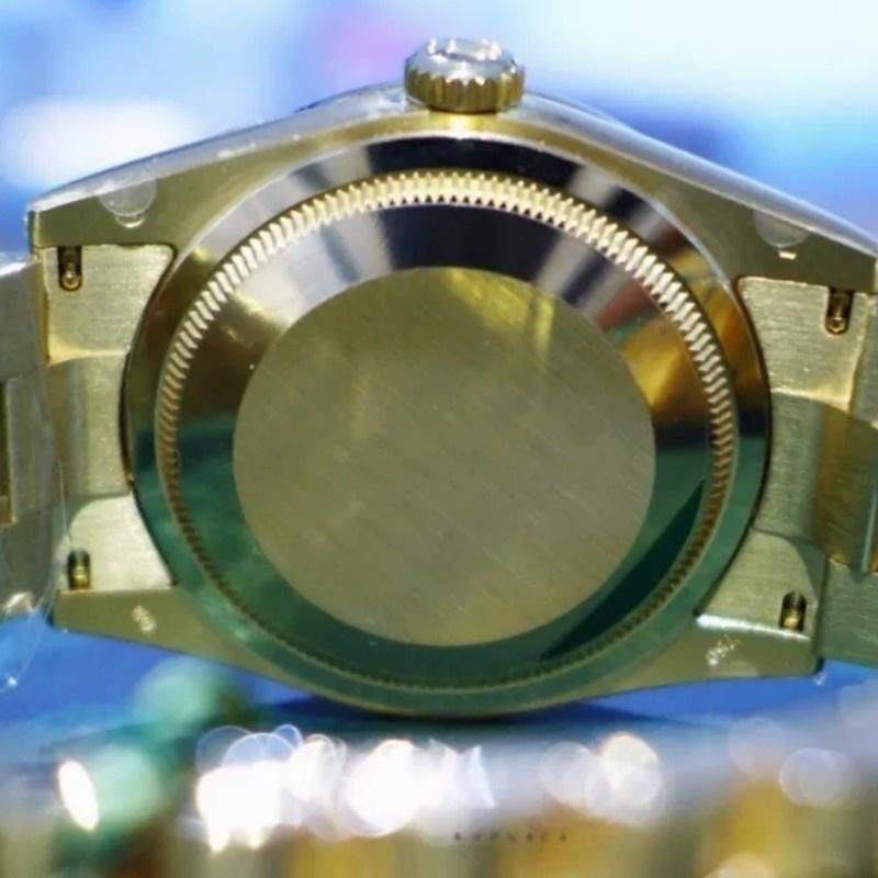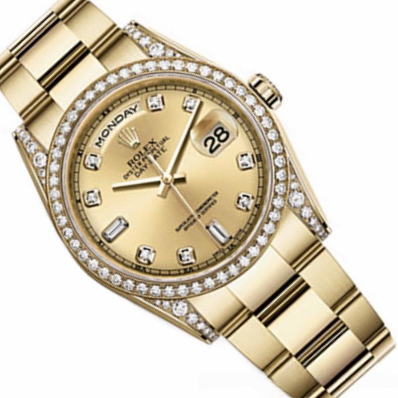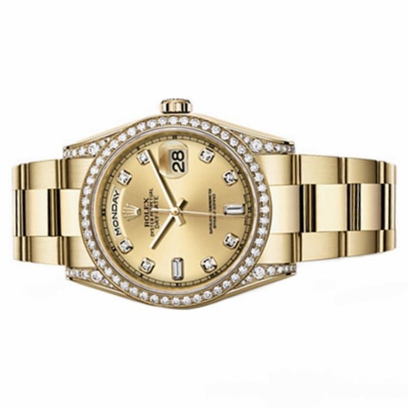 Rolex Day-Date 118388 replica watch with diamond bezel and champagne dial, 36mm, unisex, 36mm diameter yellow gold Oyster case. Twinlock double-seal screwed back and crown, diamond-set bezel, scratch-resistant sapphire crystal with Cyclops lens over the date, champagne dial, diamond hour markers, sweeping center seconds hand. Exterior divisions of minutes and 1/2 seconds, window for the day at 12, window for the date at 3. Yellow gold President bracelet with three-piece semicircular links and hidden Crownclasp folding clasp.