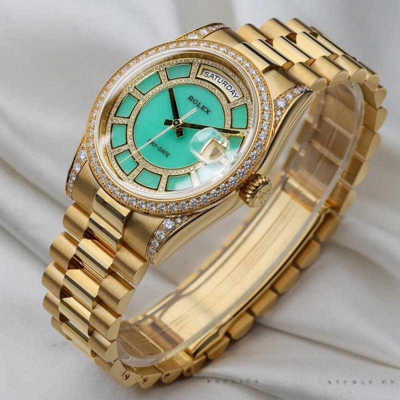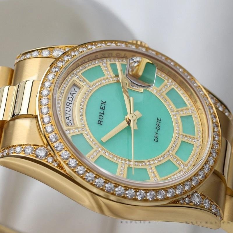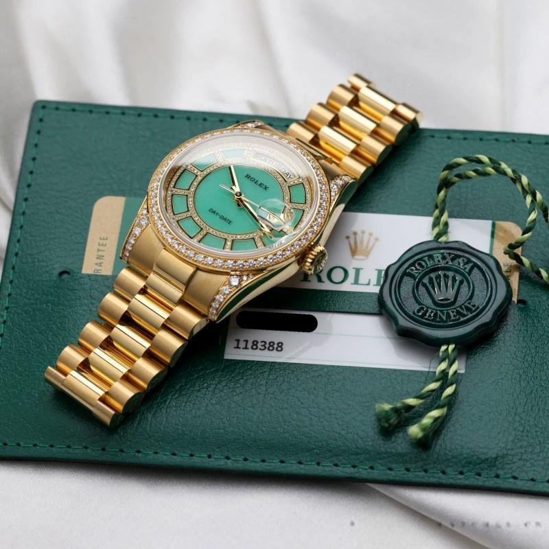 Replica Rolex Day-Date 118388 unisex watch, yellow gold, green diamonds, diamond dial, 36 mm