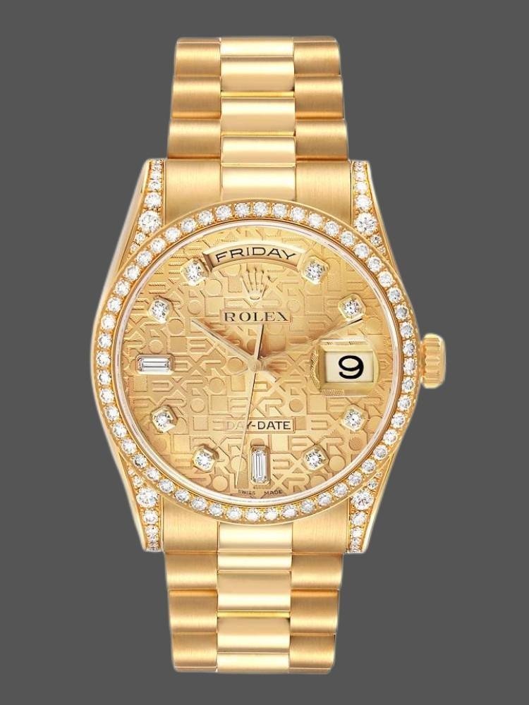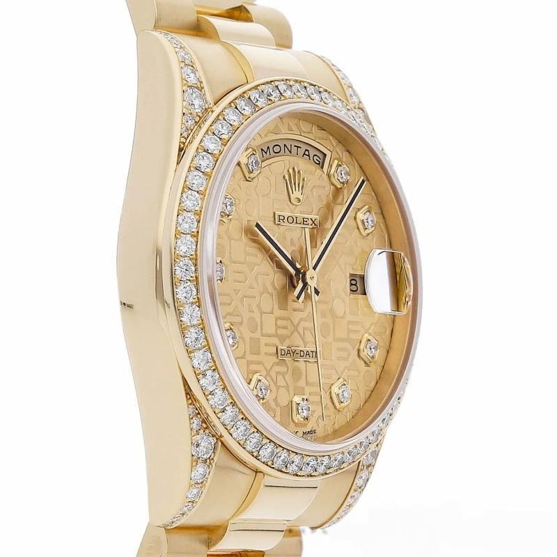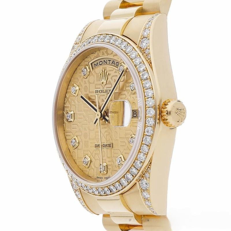 The Rolex Day-Date 118388, unisex yellow gold replica with champagne diamond dial and 36 mm, it features a 36mm yellow gold case with a bezel and diamond handles surrounding a champagne-colored Jubilee diamond dial. Scratch resistant sapphire crystal with Cyclops magnifying glass. Day window at 12 noon and date window at 3 a.m. Yellow gold President bracelet with three-piece semicircular links and hidden Crownclasp folding buckle.