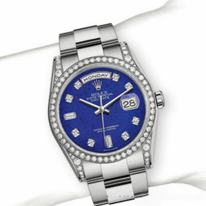 The Rolex Day-Date 118389, unisex replica with diamond bezel and 36mm blue dial, features a 36mm white gold case, blue dial, hour markers with round sparkling diamonds and baguette diamonds at 6 and 9. Scratch resistant sapphire crystal with Cyclops magnifying glass. Day of the week window at 12. Date window at 3. White gold presidential bracelet with folding buckle.