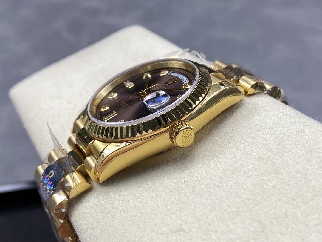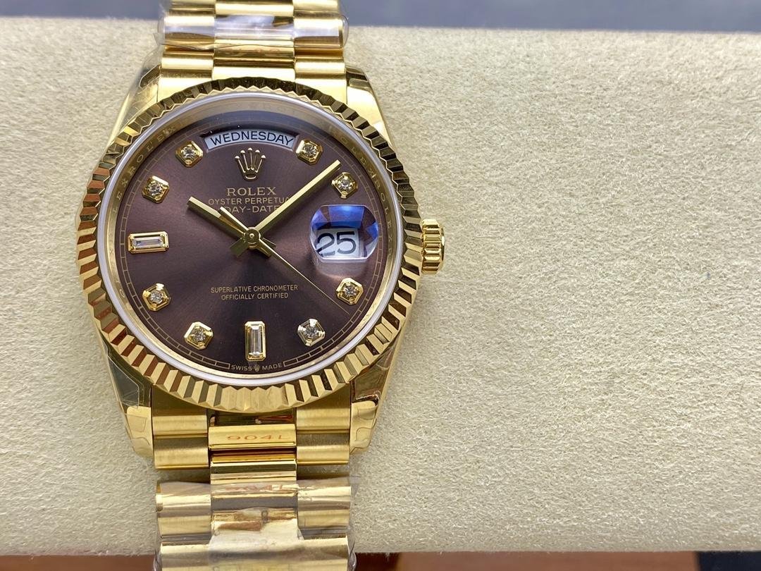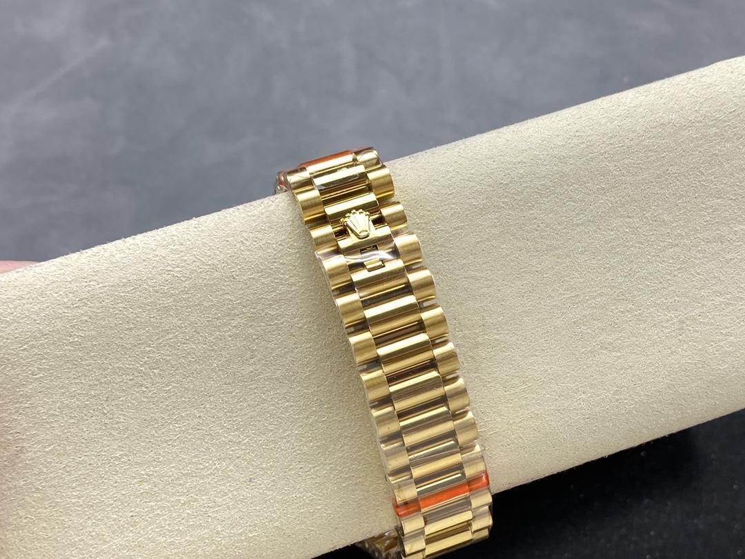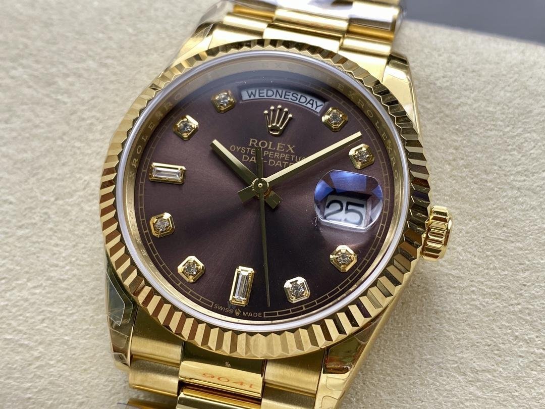 Rolex Day-Date 128238 replica watch with fluted bezel and 36 mm dark gray dial. 36mm yellow gold case, screwed back, Twinlock double-seal screw-down crown, fluted bezel, dark gray dial with diamond hour markers. Date window visible under a Cyclops lens at 3 o’clock. Day window at 12. Instant day and date adjustment. Yellow gold President bracelet with three-piece semicircular links and hidden Crownclasp folding clasp.