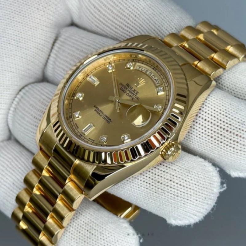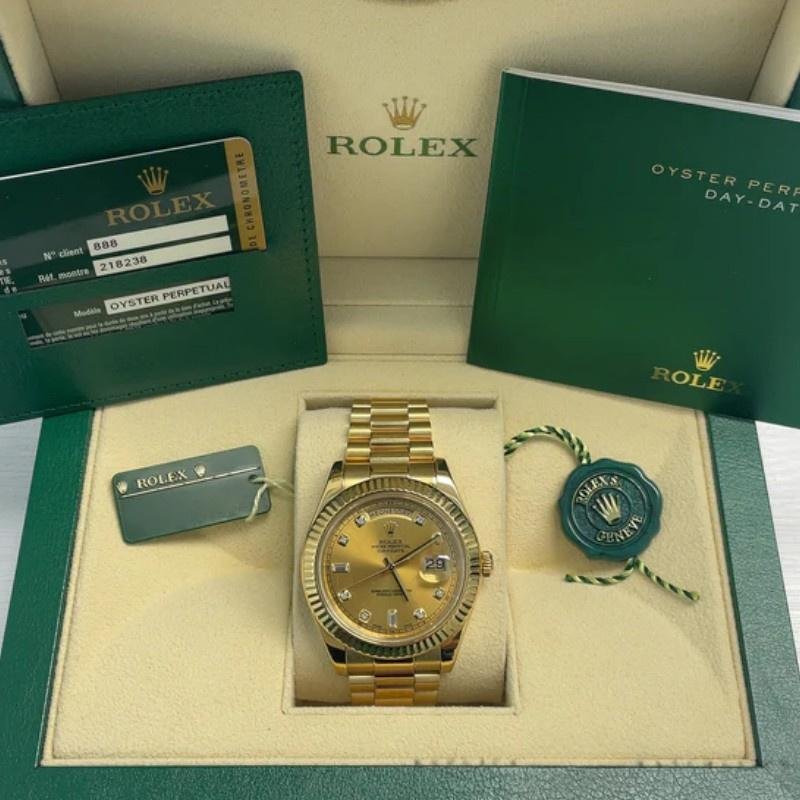 Rolex Day-Date 218238 men’s watch, replica, champagne dial, yellow gold, 41 mm. 41mm yellow gold case with solid bottom, screw-down crown and fluted yellow gold bezel. Scratch resistant sapphire crystal with Cyclops magnifying glass. Champagne dial with diamond hour markers. Baquette Diamonds at six and nine. Date window at 3 and day window at 12. Three-link yellow gold presidential bracelet with folding clasp.