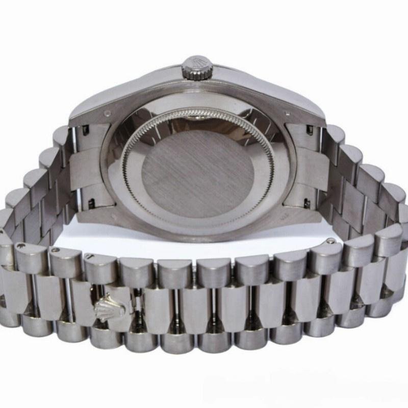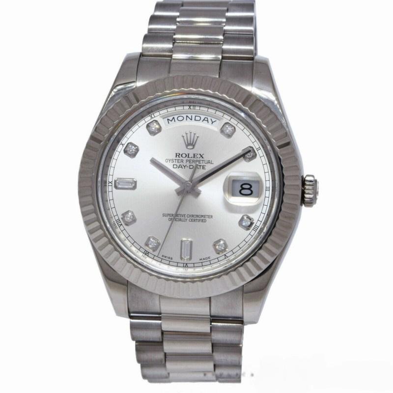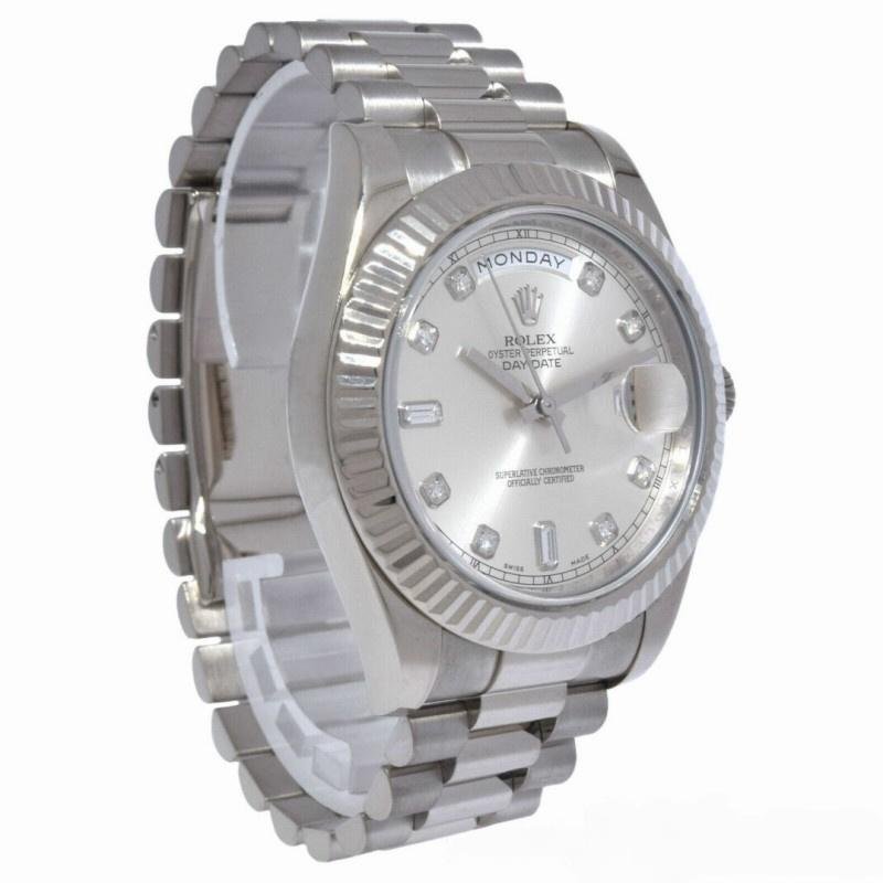 Men’s Rolex Day-Date 218239 Watch, Replica, Diamond Silver Dial, white gold, 41 mm. 41mm white gold case with solid bottom, screw-down crown and white gold fluted bezel. Scratch resistant sapphire crystal with Cyclops magnifying glass. Silver dial with diamond hour markers, date window at 3 o’clock, day window at 12 o’clock and three-link white gold presidential bracelet with folding clasp.