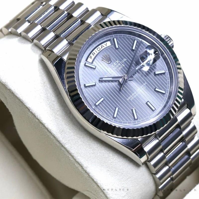 Rolex Day-Date 228239 men’s watch, replica, dark rhodium gray dial, fluted bezel, 40mm. 40mm white gold case, solid bottom with screw-down crown and fluted bezel. Scratch resistant sapphire crystal with Cyclops magnifying glass. Dark rhodium-plated gray dial with indexes, date window at 3 o’clock, day of the week window at 12 o’clock. Three-piece presidential bracelet in white gold with folding clasp.