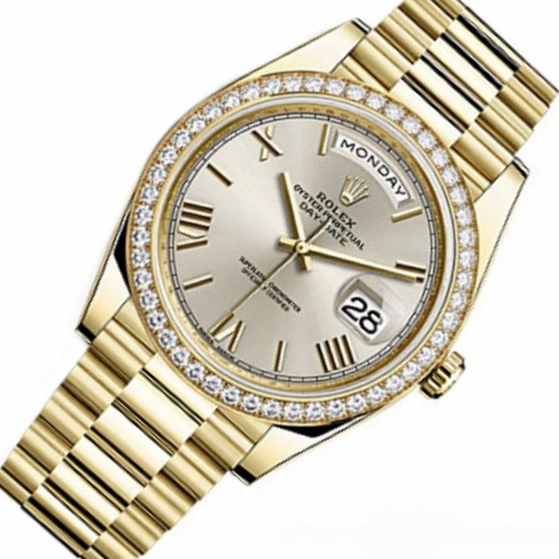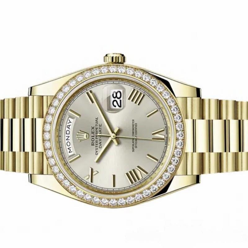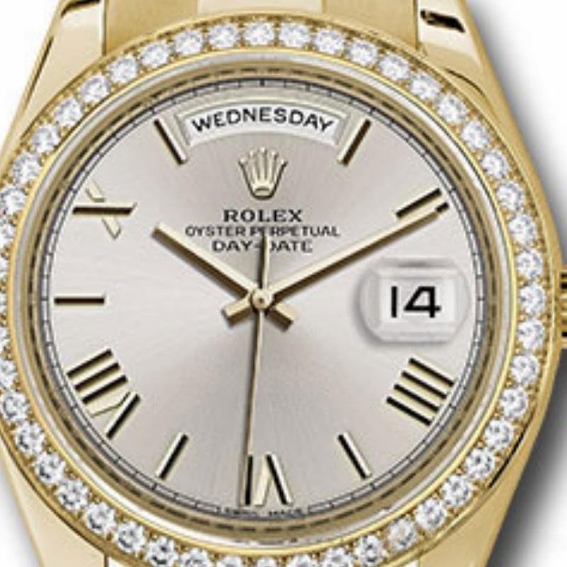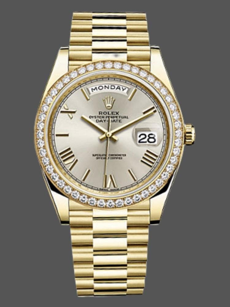 Rolex Day-Date 228348RBR men’s watch, replica, silver Roman dial, diamond bezel, 40mm. 40mm yellow gold case, solid bottom with screw-down crown and diamond bezel. Scratch resistant sapphire crystal with Cyclops magnifying glass. Silver dial with Roman numeral time markers, date window at 3 o’clock, day of the week window at 12 o’clock. Three-piece presidential bracelet in yellow gold with folding clasp.