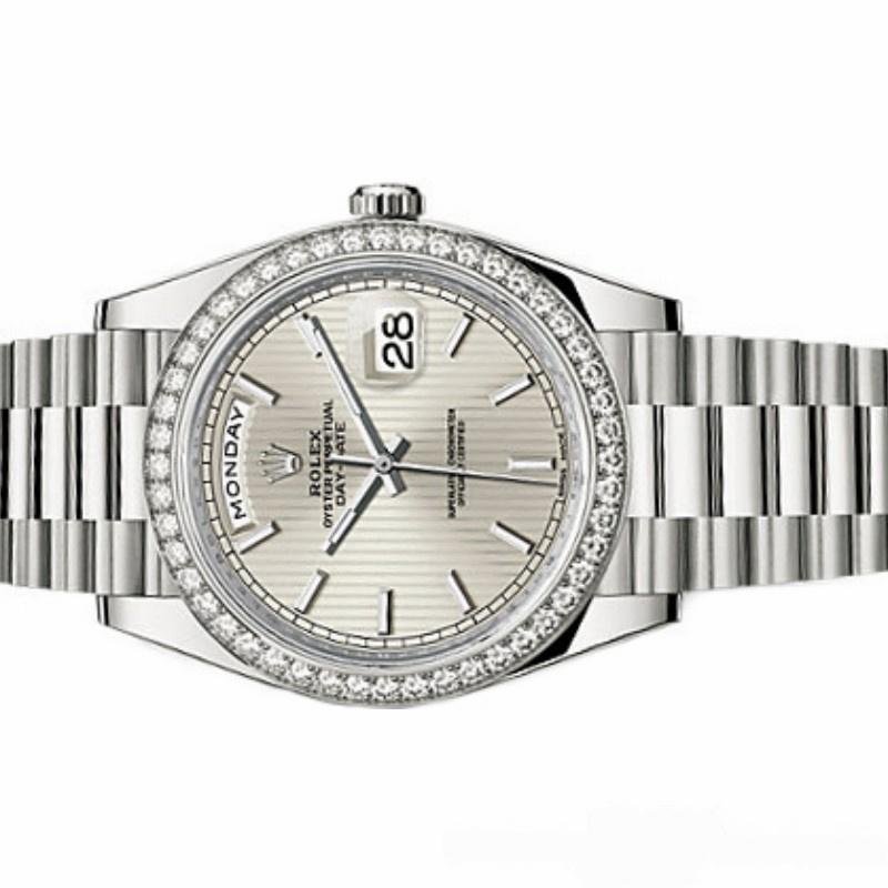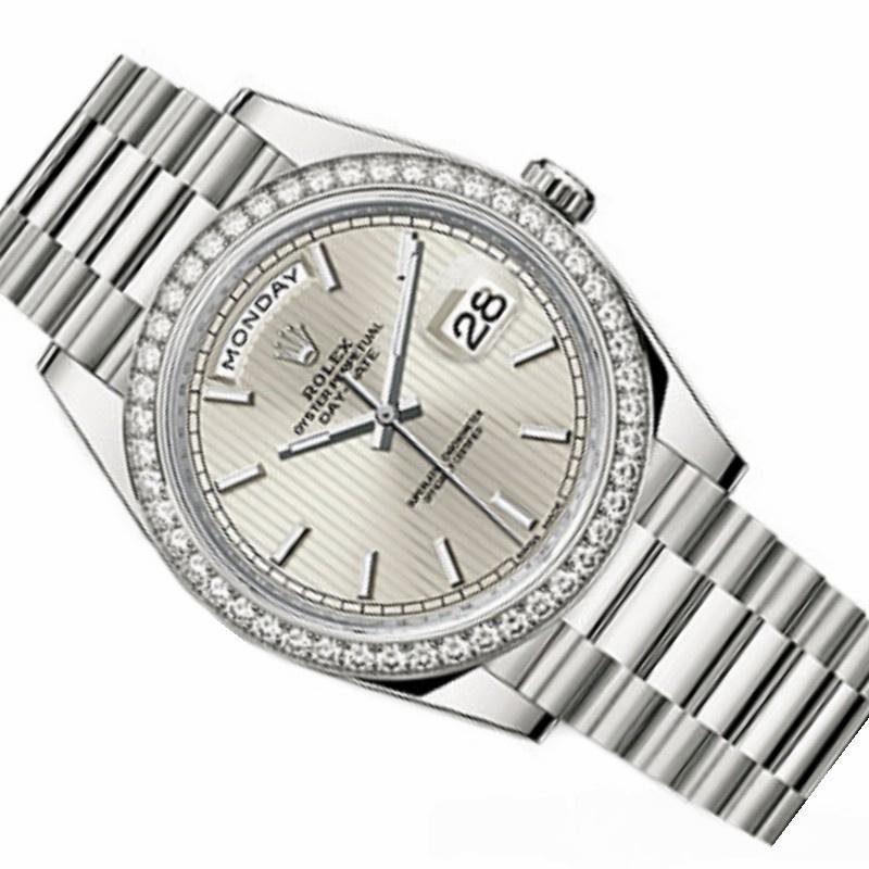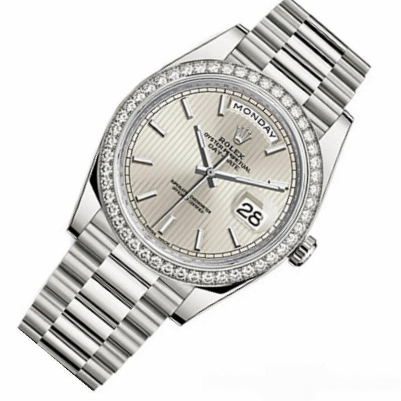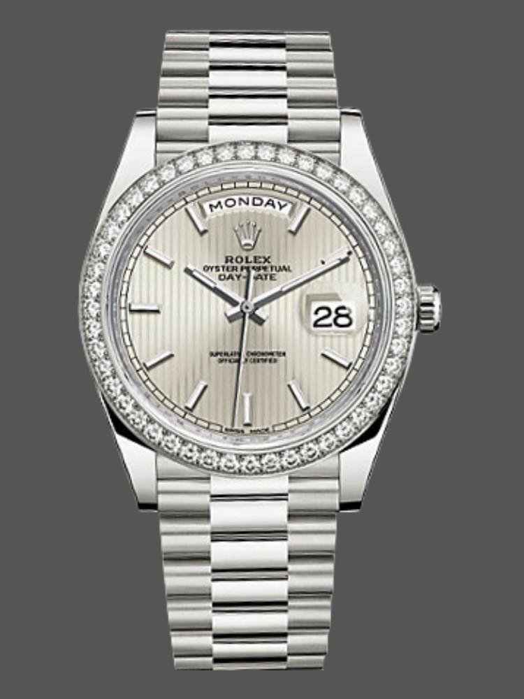 Replica Rolex Day-Date 228349RBR men’s watch, silver dial with striped motif and 40mm diamond bezel