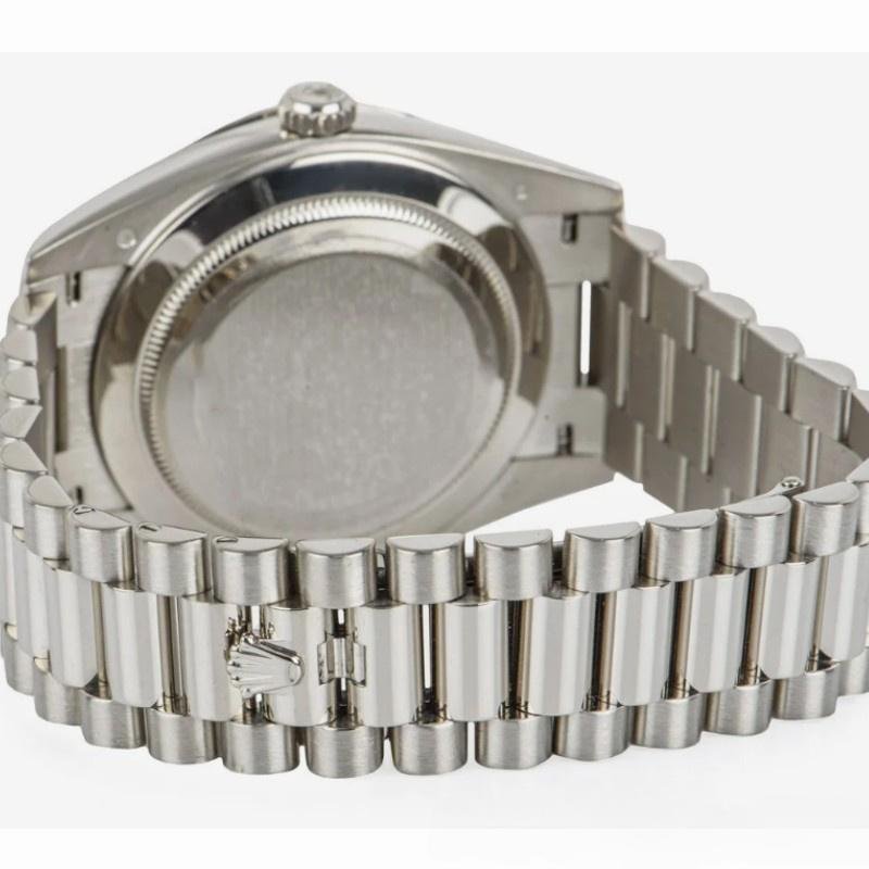 Rolex Day-Date 228349RBR Men’s Watch, 40mm Replica Silver Dial with Striped Motif and Diamond Bezel. 40mm white gold case, solid bottom with screw-down crown and diamond bezel. Scratch resistant sapphire crystal with Cyclops magnifying glass. Silver dial with striped motif, indexes, date window at 3 o’clock, day of the week window at 12 o’clock. Three-piece white gold presidential bracelet with folding clasp.