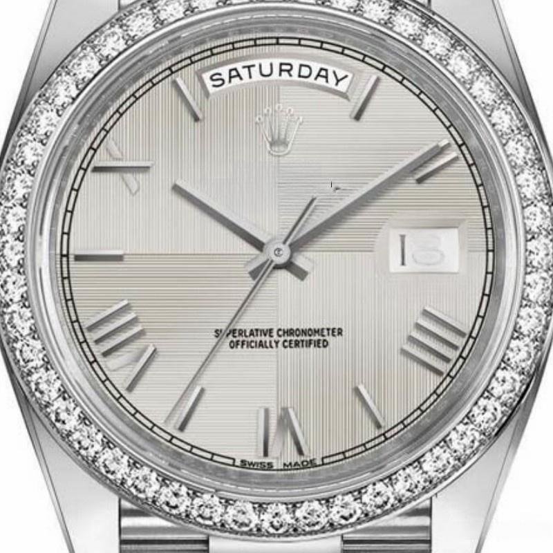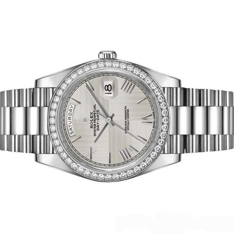 Replica Rolex Day-Date 228349RBR men’s watch, silver dial with Roman numerals and 40mm diamond bezel