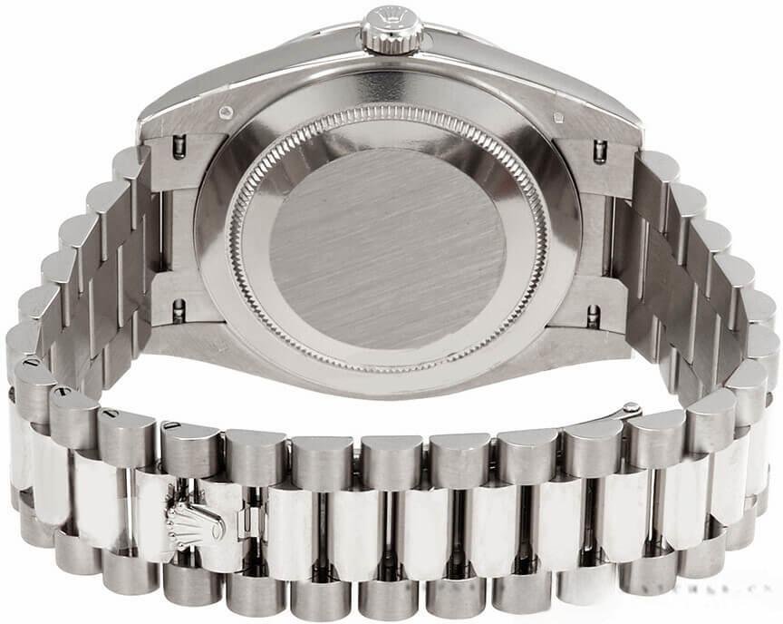Rolex Day-Date 228349RBR Men’s Watch, 40mm Replica Silver Dial with Diamond Bezel and Roman Dial. It features a 40mm white gold case, solid bottom with screw-down crown and diamond bezel. Scratch resistant sapphire crystal with Cyclops magnifying glass. Silver dial with Roman numeral time markers, date window at 3 o’clock, day of the week window at 12 o’clock. Three-piece presidential bracelet in white gold with folding clasp.