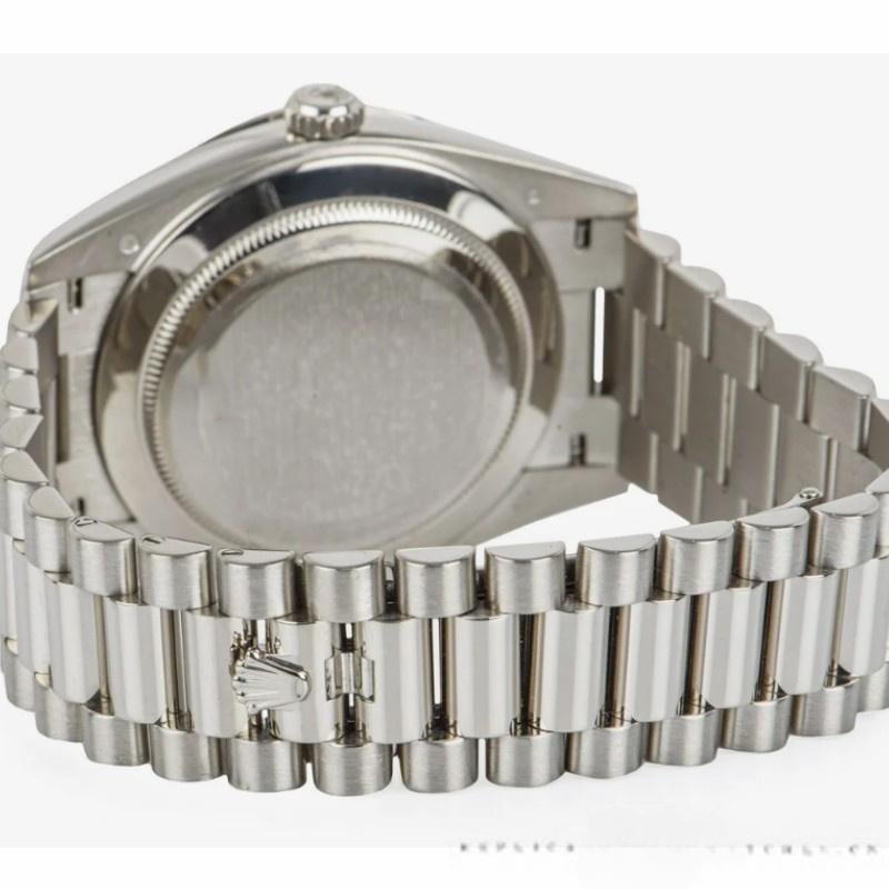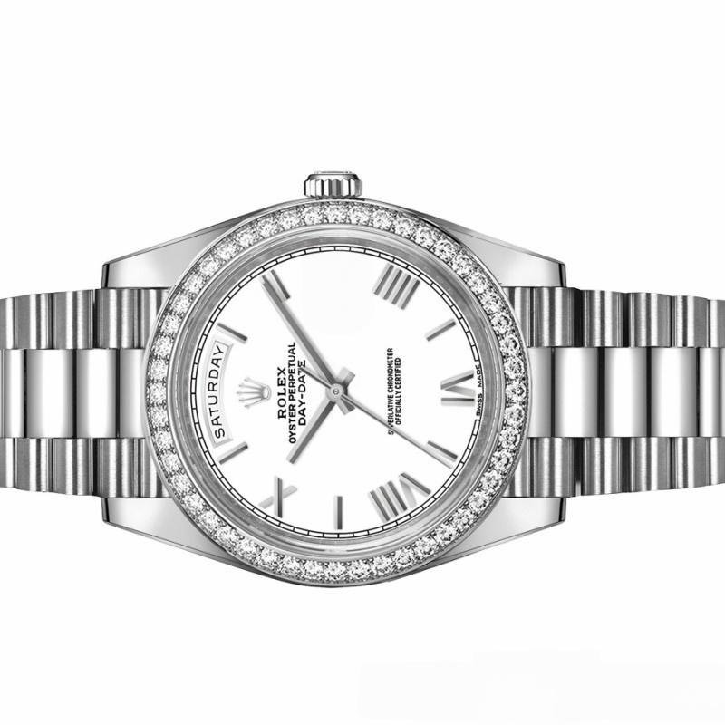 Rolex Day-Date 228349RBR Men’s Watch, 40mm Replica, White Roman Dial and Diamond Bezel. Features a 40mm white gold case, solid bottom with screw-down crown and diamond bezel. Scratch resistant sapphire crystal with Cyclops magnifying glass. White dial with Roman numeral time markers, date window at 3 o’clock, day of the week window at 12 o’clock. Three-piece presidential bracelet in white gold with folding clasp.