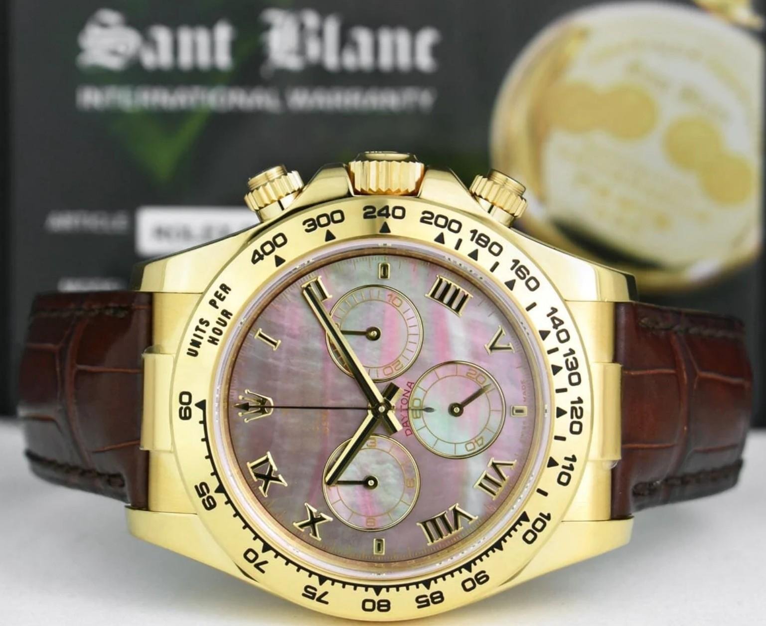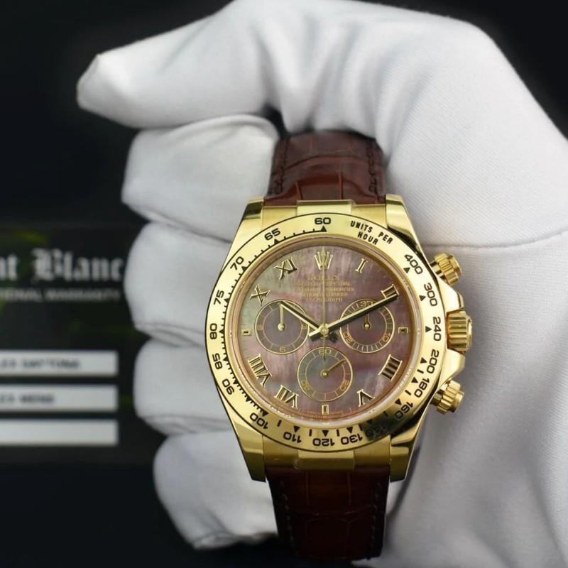 Rolex Daytona 116518 replica watch for men with 40 mm mother-of-pearl dial. 40 mm diameter yellow gold case. Yellow gold bezel with tachymetric engraving. Scratch resistant sapphire crystal. Mother-of-pearl dial with embossed Roman numerals. Small seconds hand at 6 a.m. Central chronograph hand, 30-minute counter at 3 o’clock and 12-hour counter at 9 o’clock. Brown leather strap with yellow gold folding buckle.
