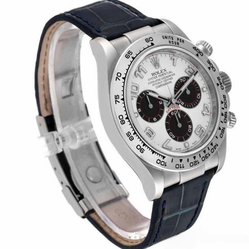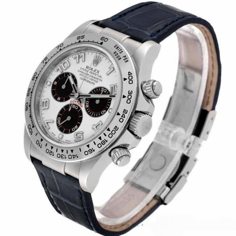 The Rolex Daytona 116519, men’s replica with “Panda” dial and the 40 mm blue leather strap has a 40 mm round white gold case. Polished stainless steel tachymetric bezel. Large Arabic hour indicator lights and black subdials with white and red details. White dial with hour and minute hands and very smooth moving seconds hand, three functional black subdials and hour markers with Arabic numerals. Brown alligator leather strap, completely hypoallergenic, with white gold folding clasp.