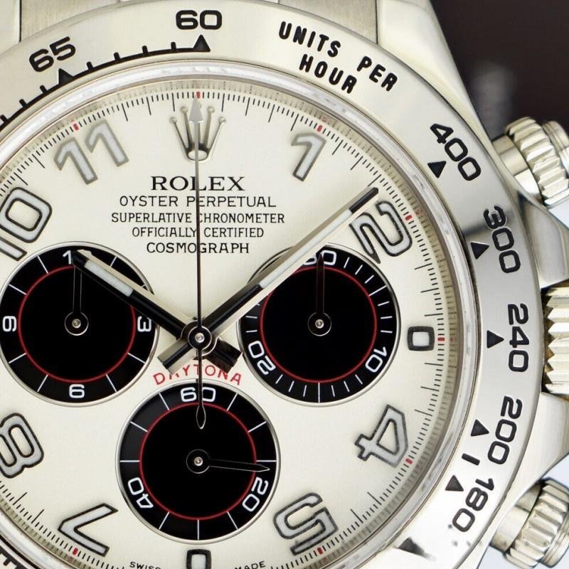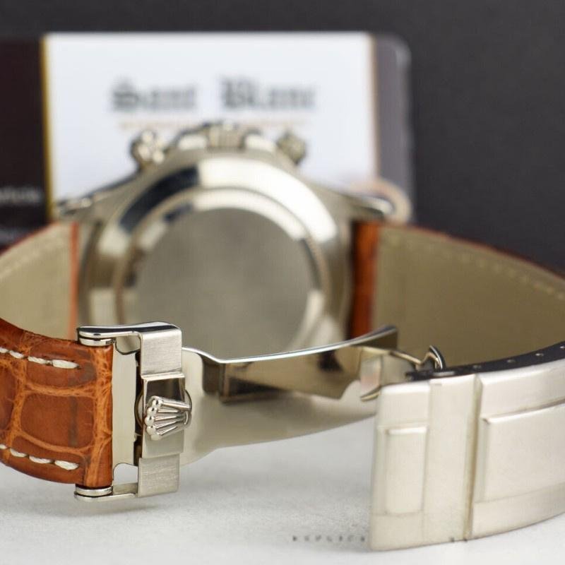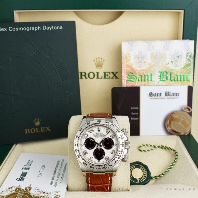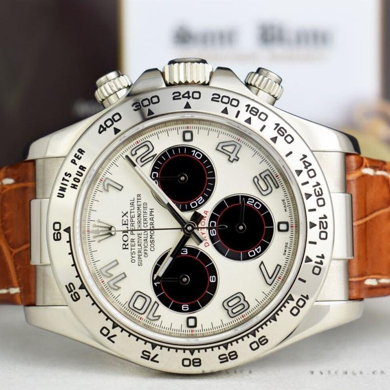 The Rolex Daytona 116519, “Panda” dial, brown leather strap, 40 mm watch for men, it has a round 40 mm white gold case. Polished stainless steel tachymetric bezel. Large Arabic hour indicator lights and black subdials with white and red details. White dial with hour, minute hands and smooth-moving seconds hand, three functional black subdials and hour markers with Arabic numerals. Brown alligator leather strap, completely hypoallergenic, with white gold folding clasp.