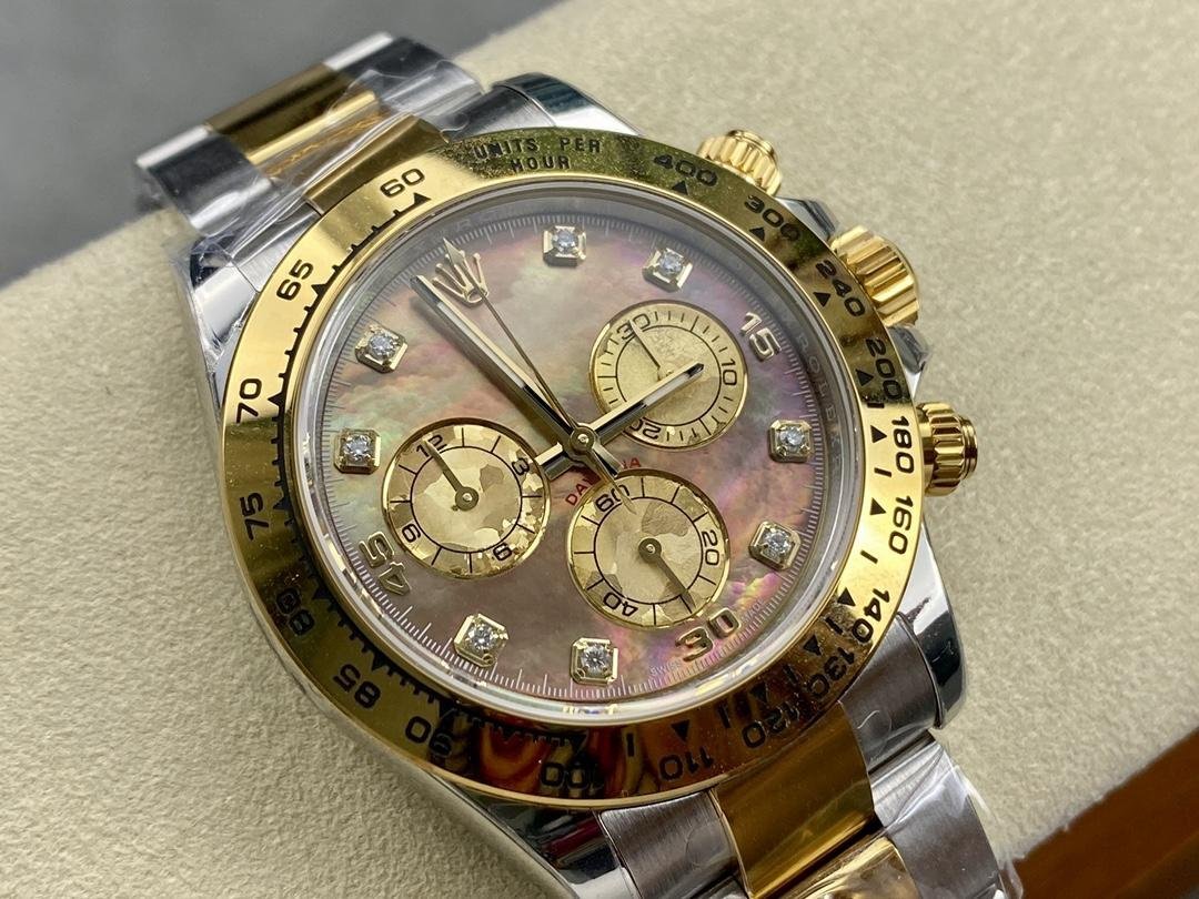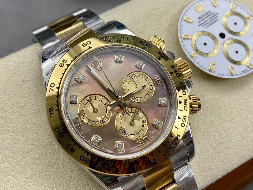 Reloj réplica Rolex Daytona 116523 Dark MOP Black Dial 40 mm para hombre. Caja de acero inoxidable de 40 mm con bisel taquimétrico de oro amarillo. Esfera de nácar oscuro con agujas doradas. Tres subesferas. Segundero pequeño a las 6 h. Contador de 30 minutos a las 3 h. Contador de 12 horas a las 9 h. Minutero en la esfera exterior. Brazalete Oyster de acero inoxidable y oro amarillo con cierre desplegable de seguridad. Se adapta a muñecas de hasta 16,5 cm. Cristal de zafiro. Fondo de caja de acero inoxidable.