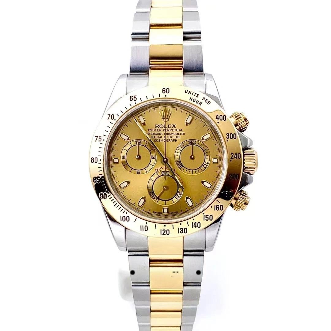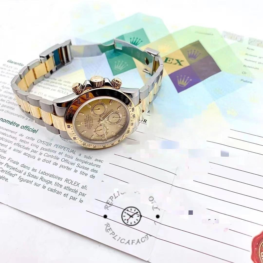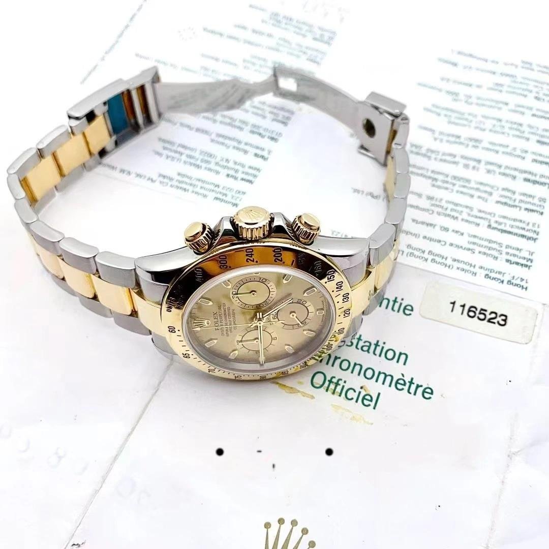 The Rolex Daytona 116523, men’s replica, stainless steel, featuring a 40mm chronograph dial, it features a 40mm round stainless steel case and yellow gold bezel with tachymeter engraving. Scratch resistant sapphire crystal. It has a champagne-colored dial with hour indexes and 12-hour and 30-minute records. Luminous yellow gold cane needles. Oyster bracelet in stainless steel and yellow gold with extendable Flip Lock folding clasp.