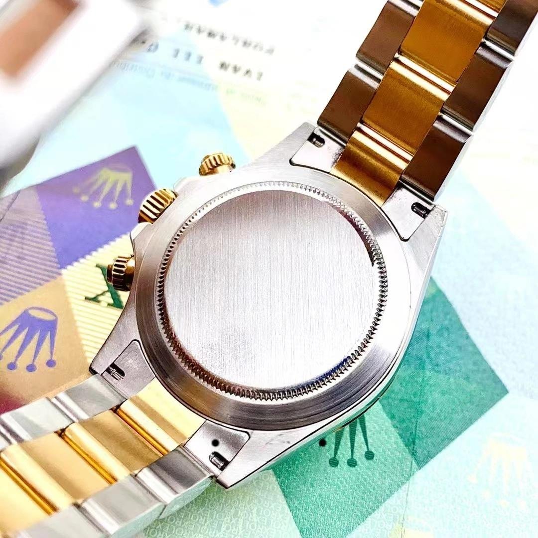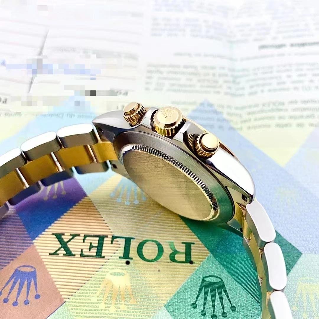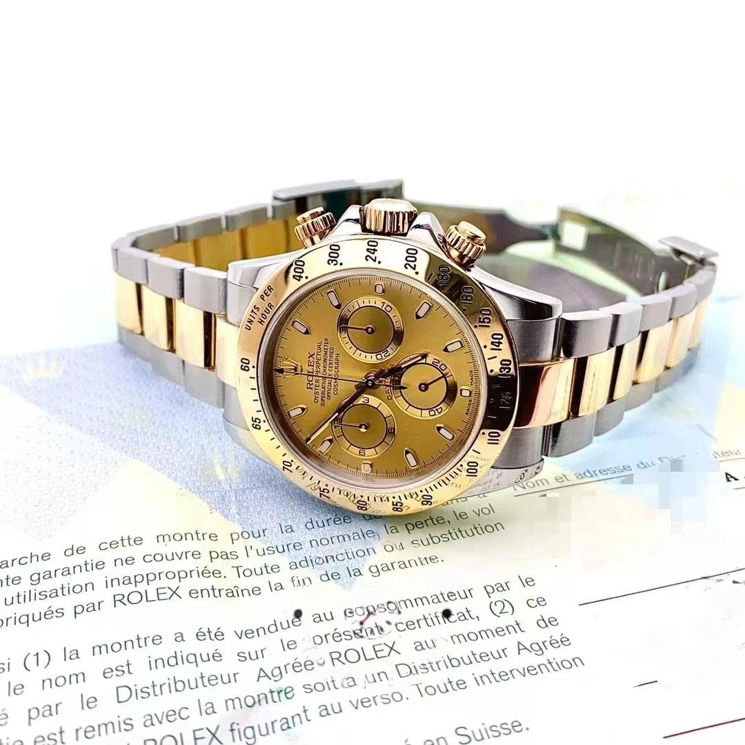 The Rolex Daytona 116523, men’s replica, stainless steel, featuring a 40mm chronograph dial, it features a 40mm round stainless steel case and yellow gold bezel with tachymeter engraving. Scratch resistant sapphire crystal. It has a champagne-colored dial with hour indexes and 12-hour and 30-minute records. Luminous yellow gold cane needles. Oyster bracelet in stainless steel and yellow gold with extendable Flip Lock folding clasp.
