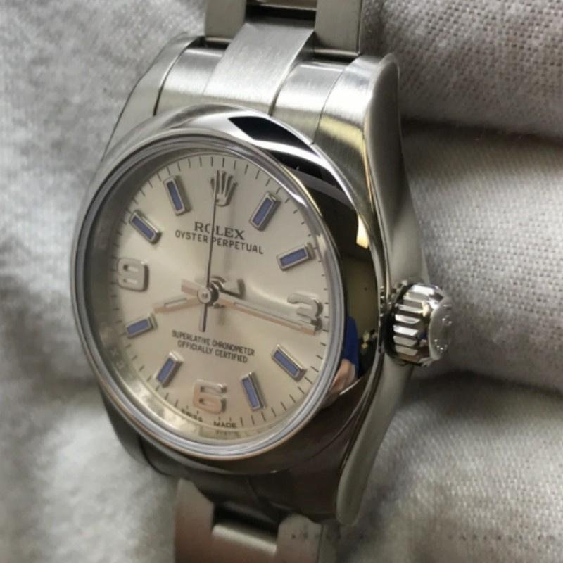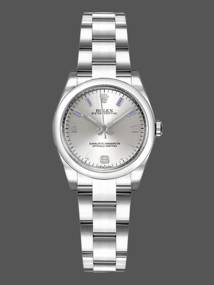 Rolex Oyster Perpetual 176200 Stainless Steel Replica Ladies Watch Silver Dial 26mm Stainless Steel Oyster Case 26mm Diameter. Smooth stainless steel domed bezel. Scratch resistant sapphire crystal. Silver dial with Arabic numerals and purple indexes. Oyster stainless steel bracelet with folding clasp.