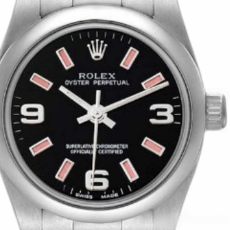 The Rolex Oyster Perpetual 176200, women’s replica, with stainless steel case, black dial and 26 mm, it features a 26mm stainless steel case and a smooth stainless steel domed bezel. Scratch resistant sapphire crystal. Black dial with Arabic numerals and pink luminous cane-type hour indices. Oyster stainless steel bracelet with folding clasp. Fits 14.7cm wrists.