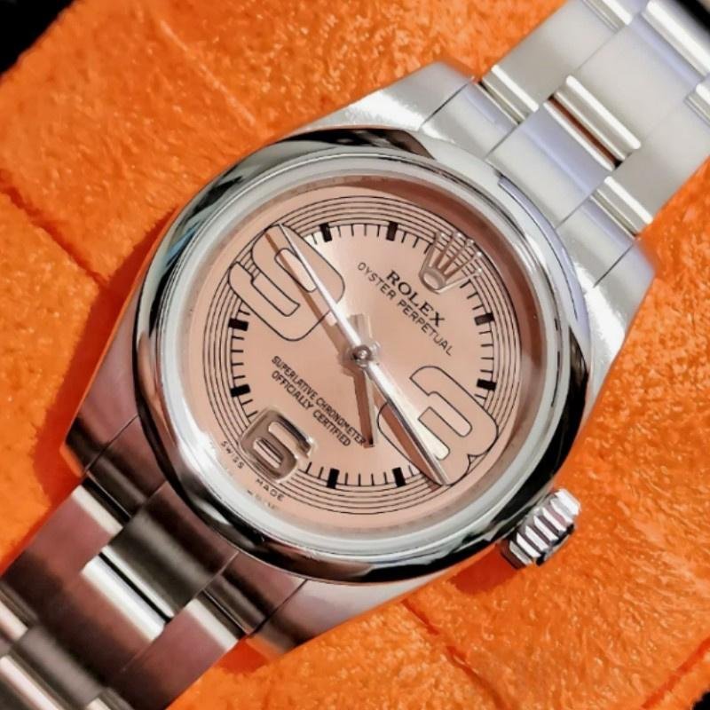 Rolex Oyster Perpetual 176200 Pink Maxi Arabic Dial Replica Watch for Women, 26 mm, 26 mm diameter stainless steel Oyster case. Smooth stainless steel domed bezel. Scratch resistant sapphire crystal. Pink dial with Arabic numerals and indexes. Oyster stainless steel bracelet with folding clasp.