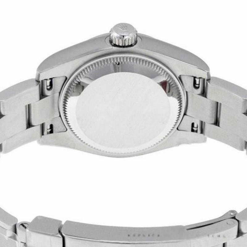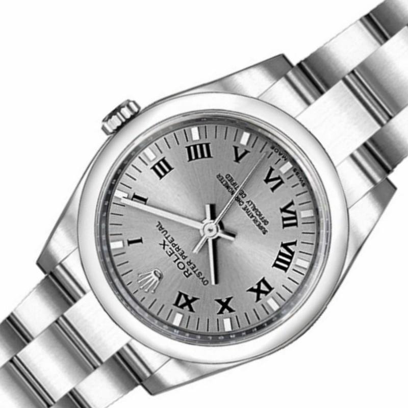 Rolex Oyster Perpetual 176200 replica watch for women, rhodium-plated gray dial with Roman numerals, 26 mm. 26 mm diameter stainless steel Oyster case. Smooth stainless steel domed bezel. Scratch resistant sapphire crystal. Rhodium-plated gray dial with indexes and hour markers in Roman numerals. Oyster stainless steel bracelet with folding clasp.