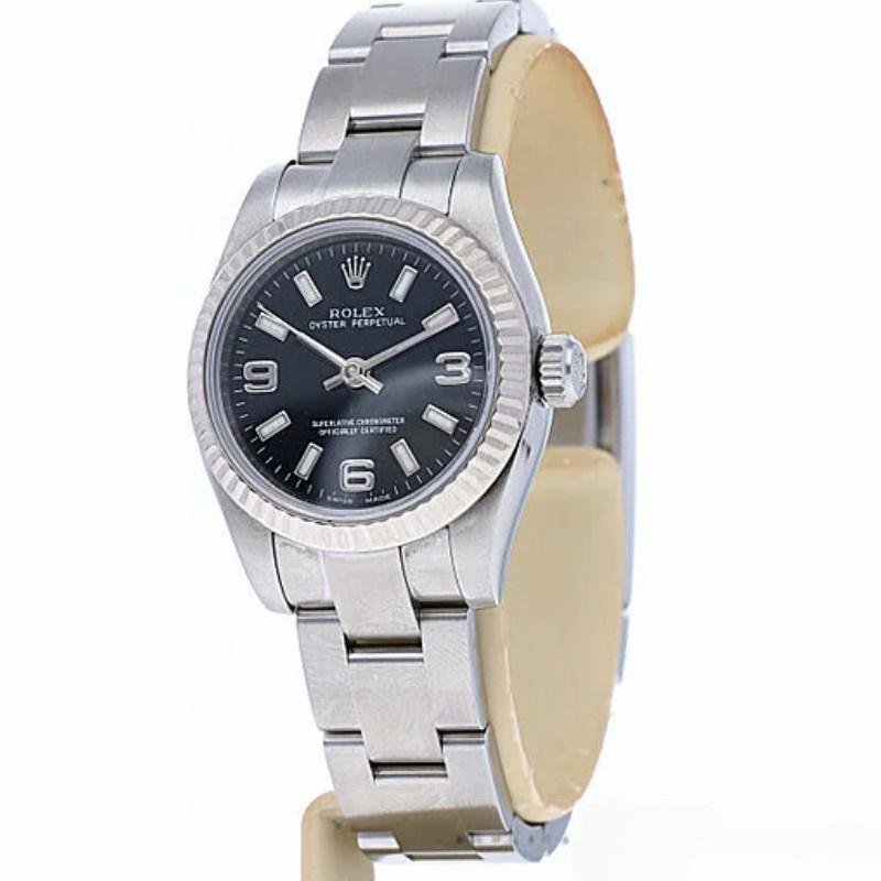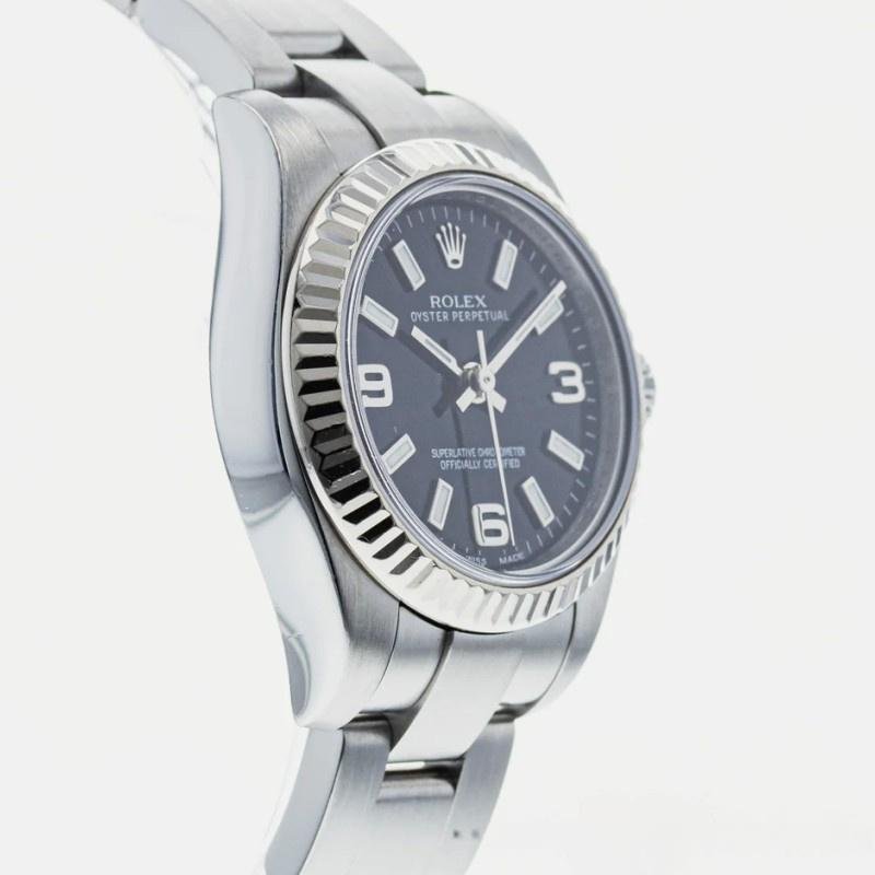Rolex Oyster Perpetual 176234 replica watch for women with fluted bezel, black Arabic dial, 26 mm. 26mm diameter stainless steel Oyster case. White gold fluted bezel. Scratch resistant sapphire crystal. Black dial with white luminous Arabic numerals and baton-type hour indices. Oyster stainless steel bracelet with folding clasp.