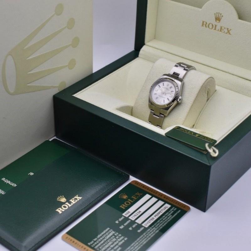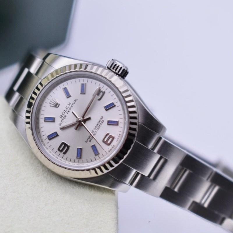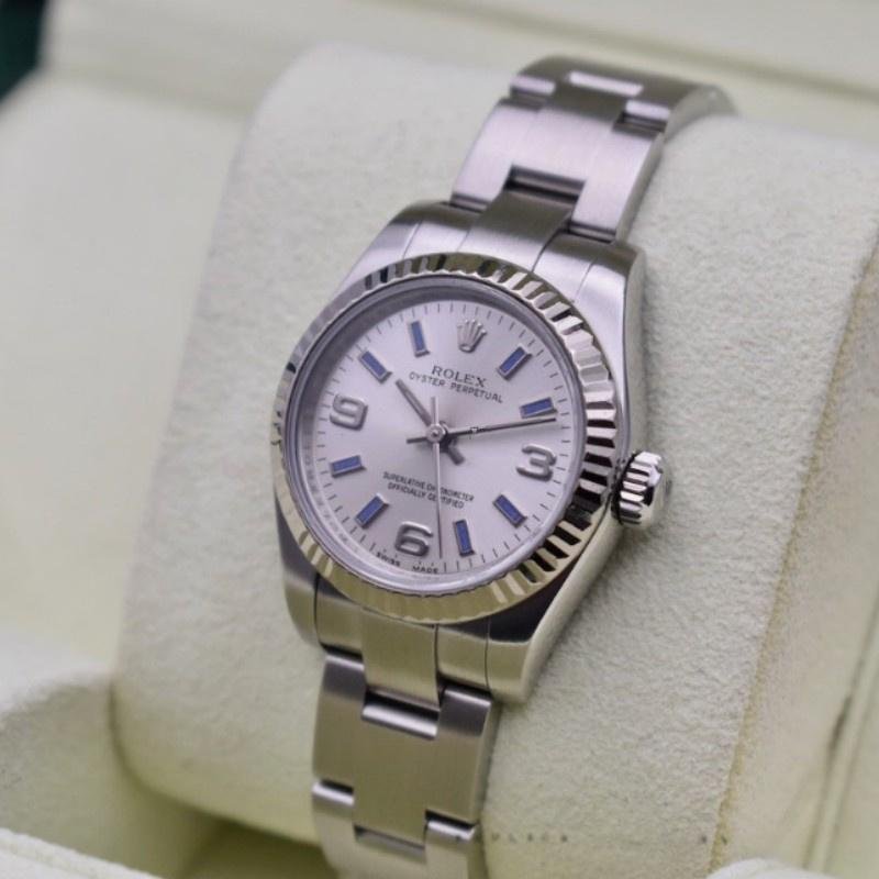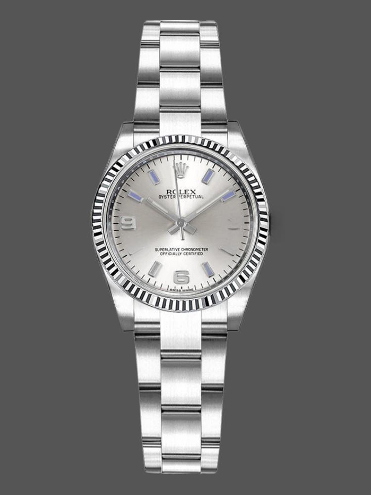 Rolex Oyster Perpetual 176234 replica watch for women, silver dial, blue dial, 26 mm. 26 mm diameter stainless steel Oyster case. White gold fluted bezel. Scratch resistant sapphire crystal. Silver dial with Arabic numerals and blue cane-type luminous indices. Oyster stainless steel bracelet with folding clasp.