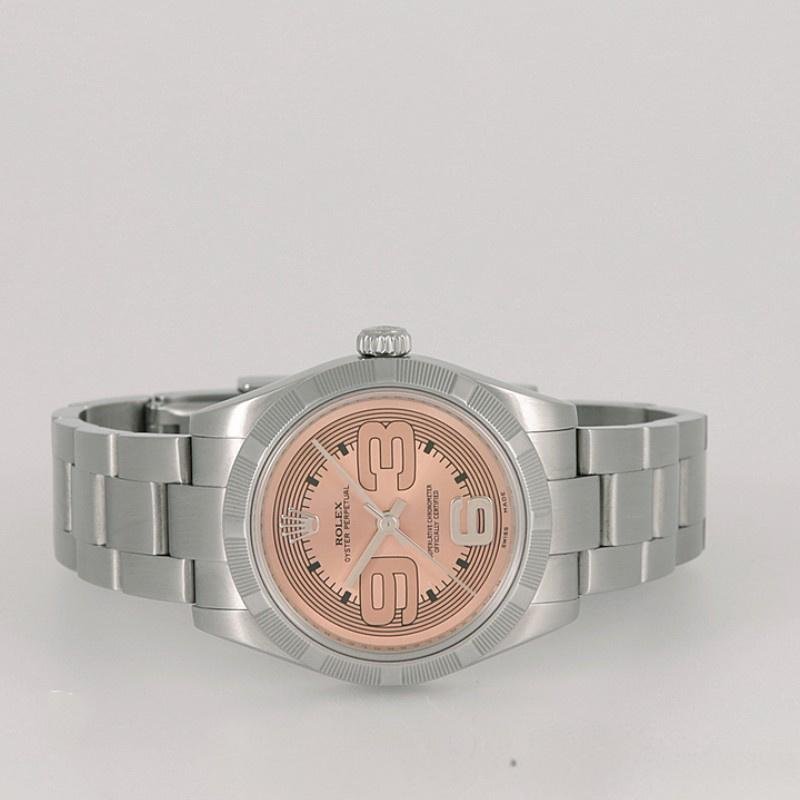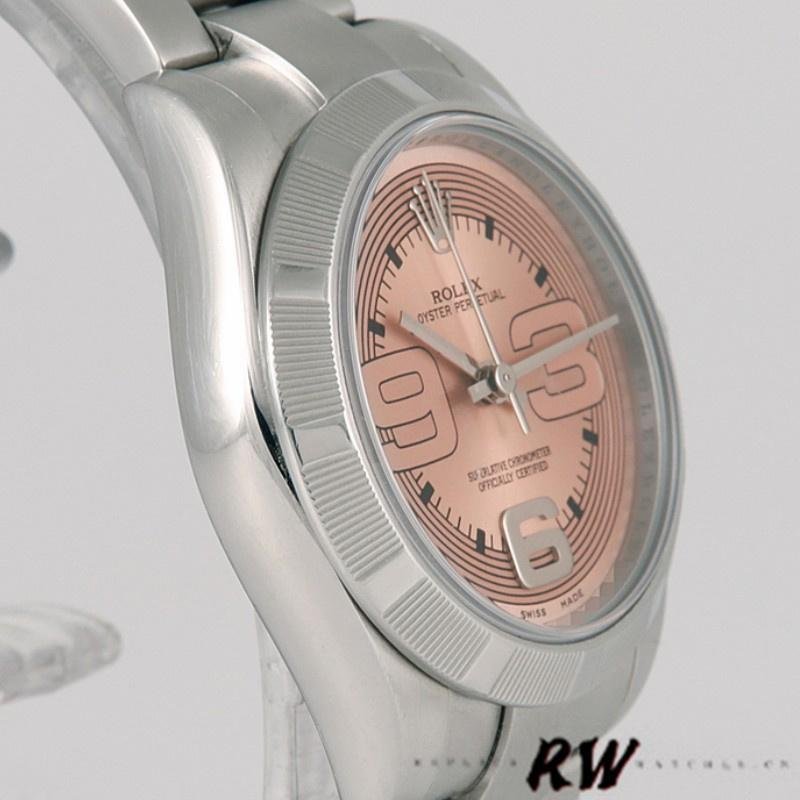 The Rolex Oyster Perpetual 177210 Pink Maxi Arabic Dial 31 mm, replica for women, it features a 31mm round stainless steel case with screw-down crown and turned bezel. Pink dial with maxi Arabic numerals. The reliable stainless steel Oyster bracelet will look perfect on your wrist.
