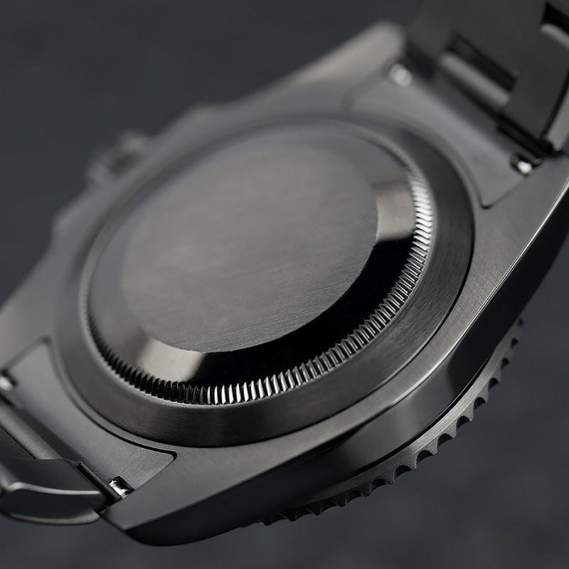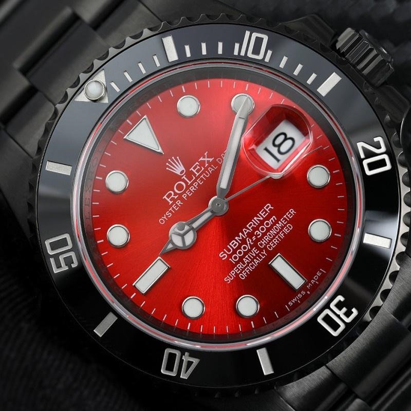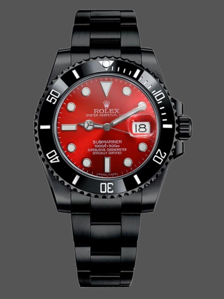 The Rolex Submariner Date 116610LN, men’s replica, red dial, stainless steel with black PVD/DLC coating, 40 mm, round stainless steel case with 40 mm DLC/PVD coating, screw-down crown and ceramic bezel. Personalized red dial with hour markers with luminescent dots. Recorded 60-minute scale and graduations on the bezel. Numbers, date window with magnifying glass at 3 o’clock, sapphire crystal, unidirectional rotating bezel. The reliable DLC/PVD coated stainless steel Rolex Oyster bracelet will look perfect on your wrist.