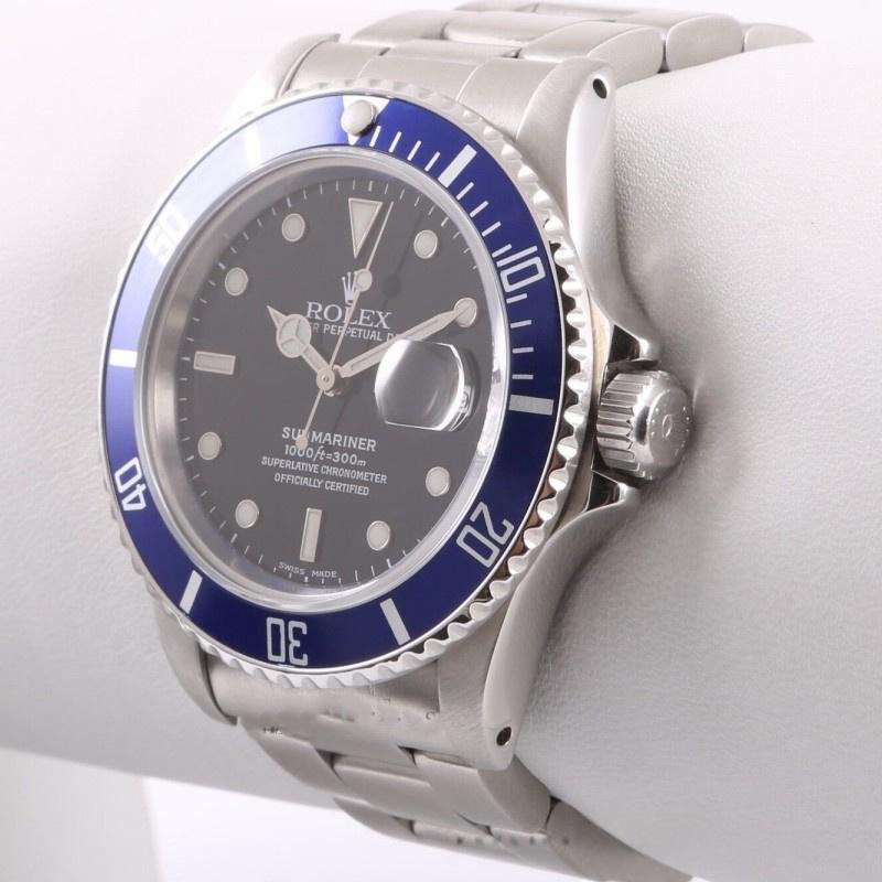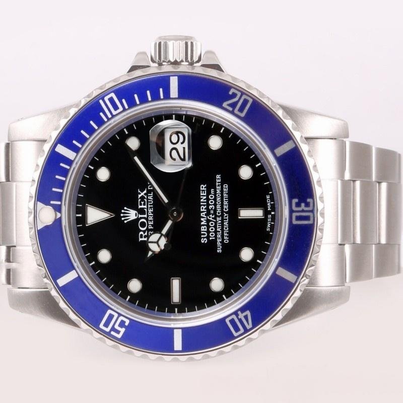 Rolex Submariner Date 16610 replica watch in blue ceramic and black dial for men 40 mm. 40mm stainless steel case, black dial, large hour markers with dots and indexes, blue ceramic bezel with Cerachrom insert and engraved 60-minute scale and graduations on the bezel. Numbers, date window with magnifying glass at 3 o’clock, sapphire crystal, unidirectional rotating bezel, screw-down crown, stainless steel Oyster bracelet with Oysterlock folding safety clasp.