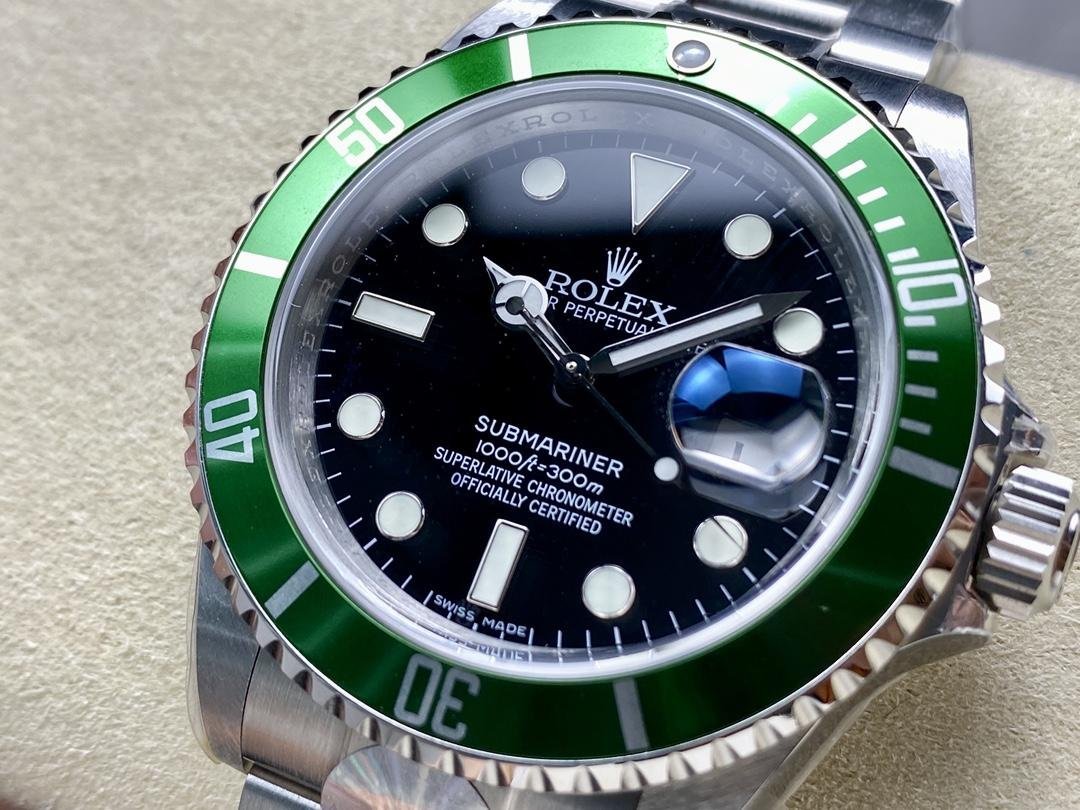 Rolex Submariner Date 16610LV Oyster 40mm Stainless Steel Replica Watch with Black Dial for Men. 40mm stainless steel case, black dial, large hour markers with dots and indexes, ceramic bezel with green Cerachrom insert and engraved 60-minute scale and graduations on the bezel. Numbers, date window with magnifying glass at 3 o’clock, sapphire crystal, unidirectional rotating bezel, screw-down crown, stainless steel Oyster bracelet with Oysterlock folding safety clasp.