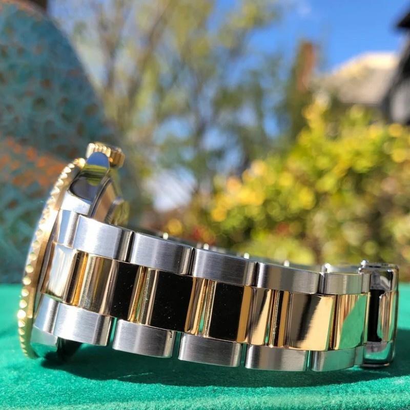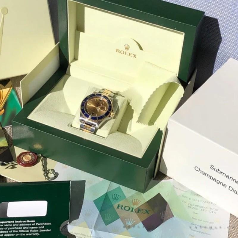 Rolex Submariner Date 16613 Champagne Serti Dial 40 mm Replica watch for men. 40mm stainless steel Oyster case. Features a brushed steel case accented by a yellow gold unidirectional diving bezel. Features a “Serti” champagne-set diamond and sapphire dial with applied diamond and sapphire-set indexes, luminous polished gold hands and an enlarged date window at 3 o’clock. Oyster stainless steel and yellow gold bracelet with safety clasp. Fits 19cm wrists.