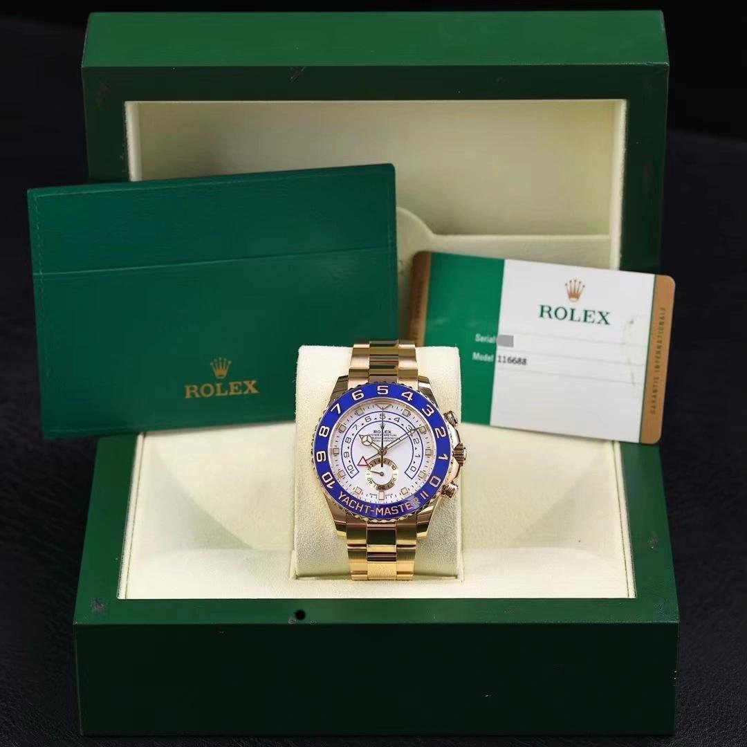 Rolex Yacht-Master II 116688 replica watch for men, white dial, 44 mm. This Regatta chronograph features the world’s first programmable mechanical memory countdown. 44mm yellow gold case with yellow gold fluted bezel. White dial with golden luminous hands and indexes. The subdial shows a small seconds hand. Minute marker on the outer dial. Blue ceramic rotating bezel, Regatta chronograph with countdown, programmable countdown, white dial with yellow gold Mercedes hands and indexes, red details, small seconds hand at 6 o’clock and sapphire crystal. Compatible with wrists up to 7.25 inches.