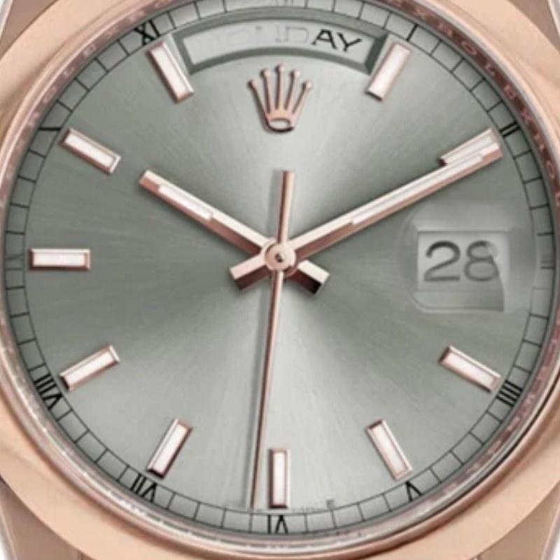 Rolex Day-Date 118205 replica watch, gray dial, rose gold, 36 mm, unisex. 36mm Everose gold case with Everose gold President bracelet. Everose gold domed fixed bezel. Rhodium dial with rose gold hands and hour markers with indexes. Date display at 3 o’clock; display of the day at 12 noon. Automatic movement. Scratch resistant sapphire crystal. Screw-down crown.