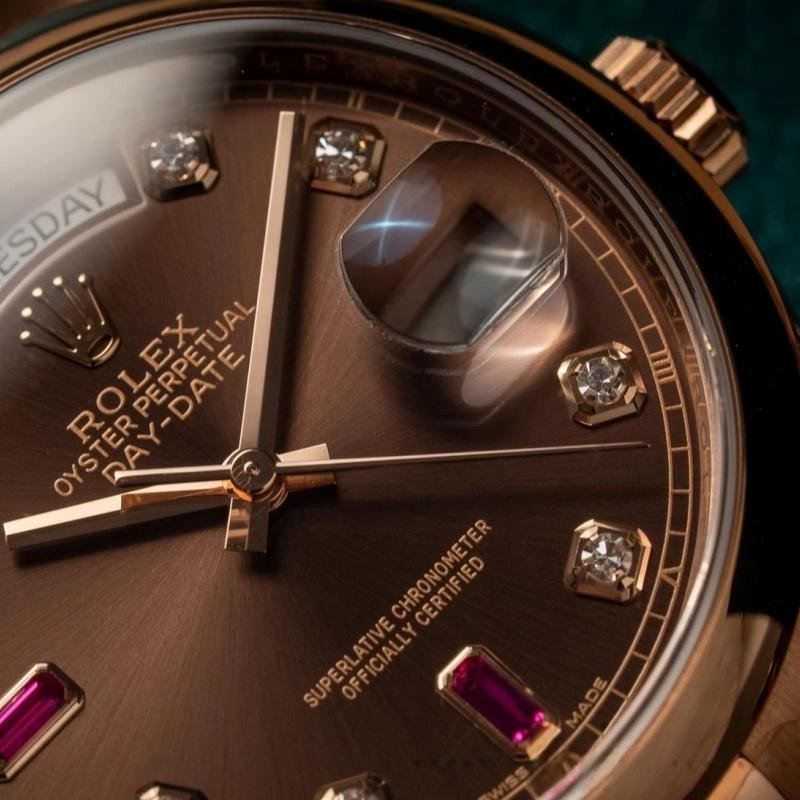 Unisex Rolex Day-Date 118205 watch, rose gold replica, chocolate brown dial, 36 mm. 36mm stainless steel case. Diamonds and rubies set on the chocolate brown dial. Everose gold domed bezel. This watch features a folding buckle strap, Oyster case and bracelet in Everose gold, and scratch-resistant sapphire crystal.