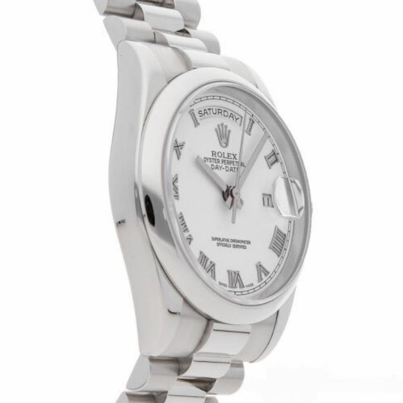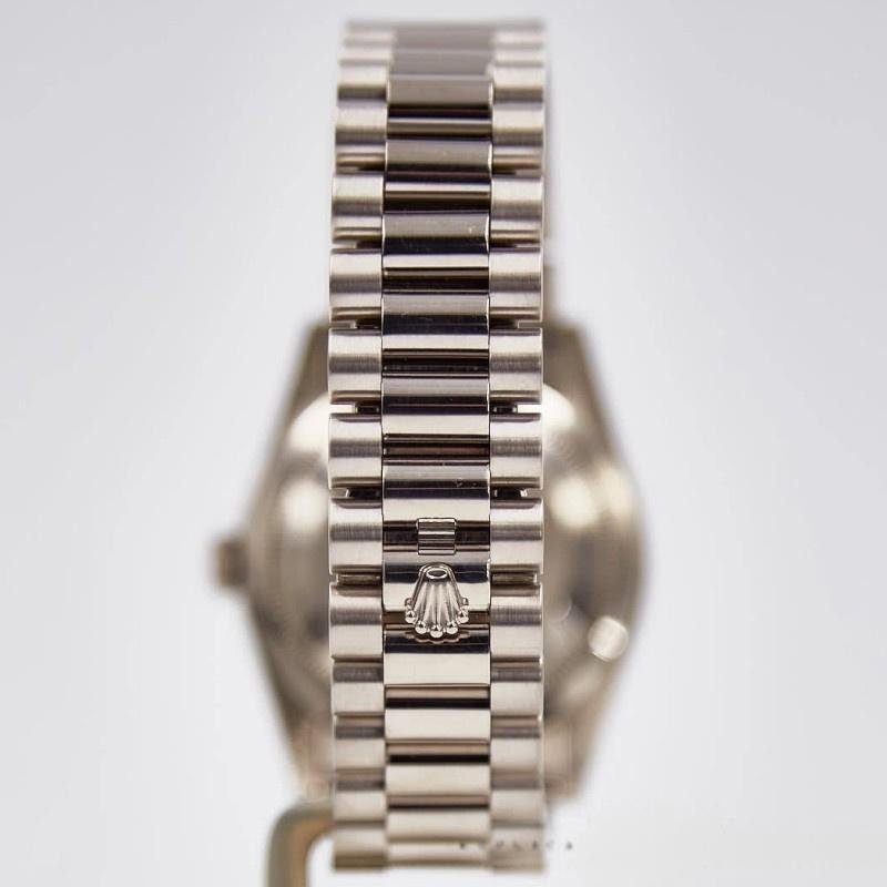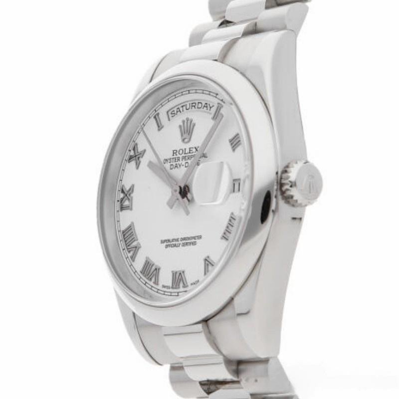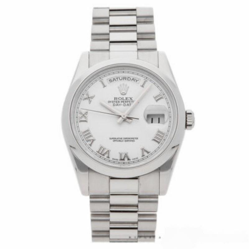 Unisex Rolex Day-Date 118206 white replica watch with 36 mm Roman numerals. The white dial and Roman numerals serve as hour markers on the President bracelet. The platinum version with a smooth bezel is perfect for small men’s or women’s wrists, thanks to its 36 mm case. The day of the week at 12, written in full in any language in the world, is a feature of these watches. This bracelet is only available in precious metals and features three rows of smooth, flat links that will not damage the cuffs of a shirt.