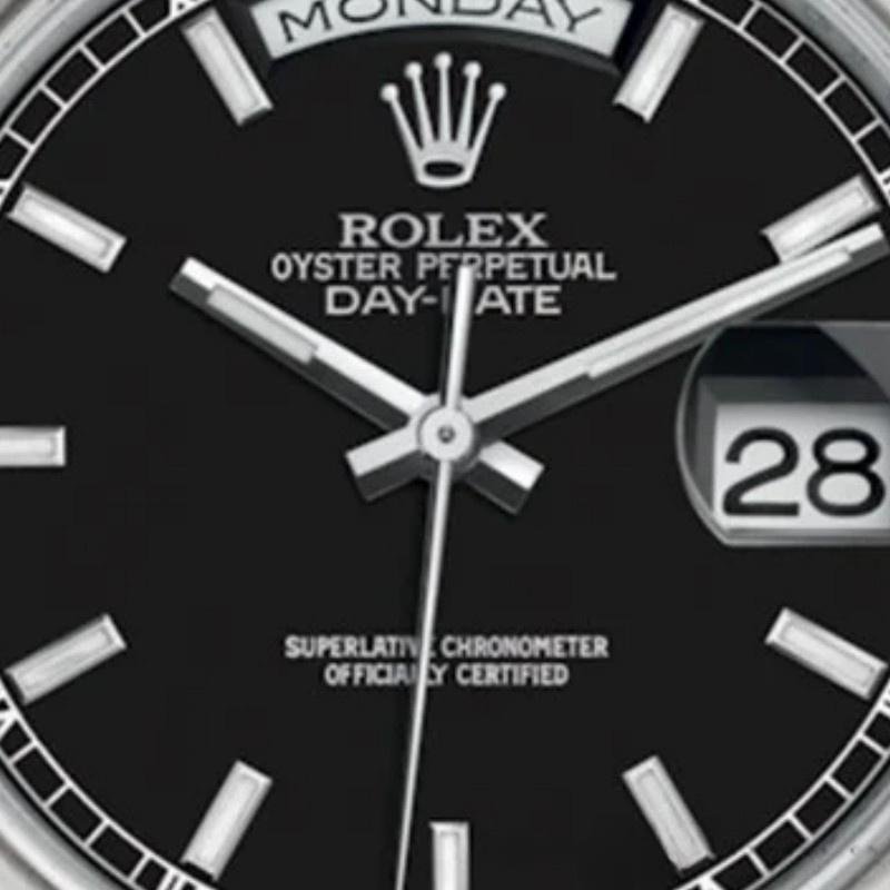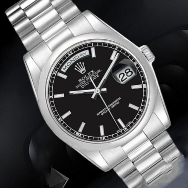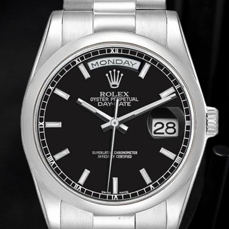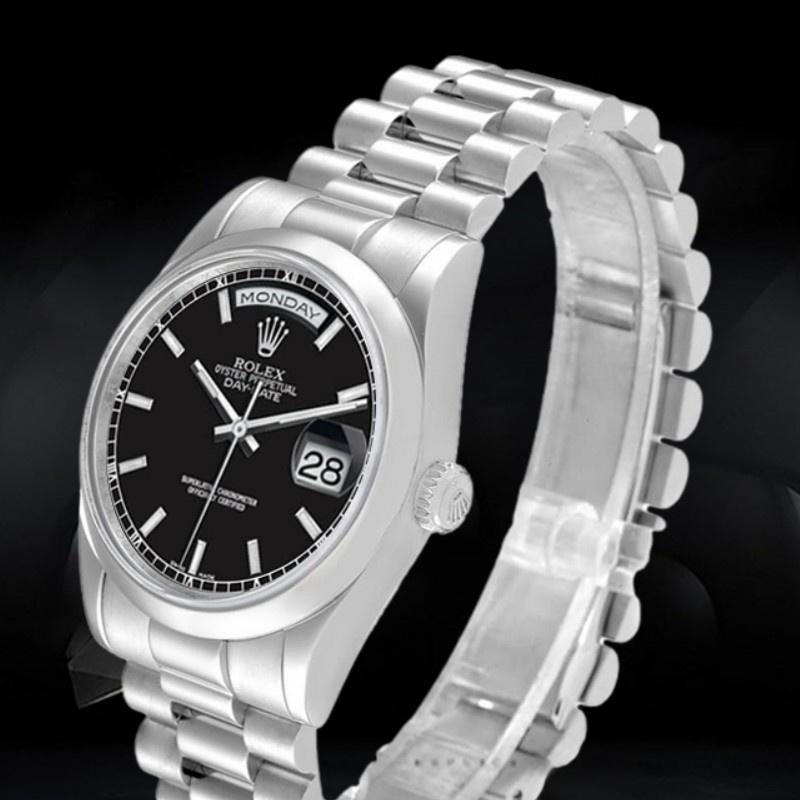 Rolex Day Date 118206 Platinum Unisex Replica Watch, Black Dial, 36mm. 36mm solid platinum Oyster case, screwed. Case and crown background. Polished platinum domed bezel. Black dial, day indicator at 12 noon, date indicator at 3 o’clock, sapphire crystal. President platinum bracelet with 3-row semicircular links. Hidden Crown closure with folding buckle.