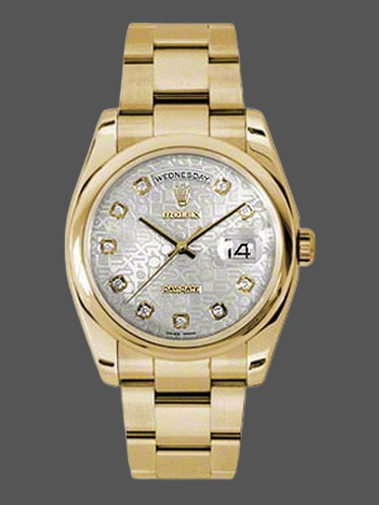 Rolex Day-Date 118208 unisex replica watch, silver dial with diamonds and Jubilee, 36 mm. 36mm yellow gold case with yellow gold President bracelet. Fixed yellow gold domed bezel. Silver Jubilee dial with diamonds set, with days in Spanish instead of twelve. Date display at 3. Polished bezel, with yellow gold President bracelet. Scratch resistant sapphire crystal. Screw-down crown. Solid caseback.