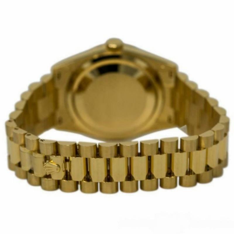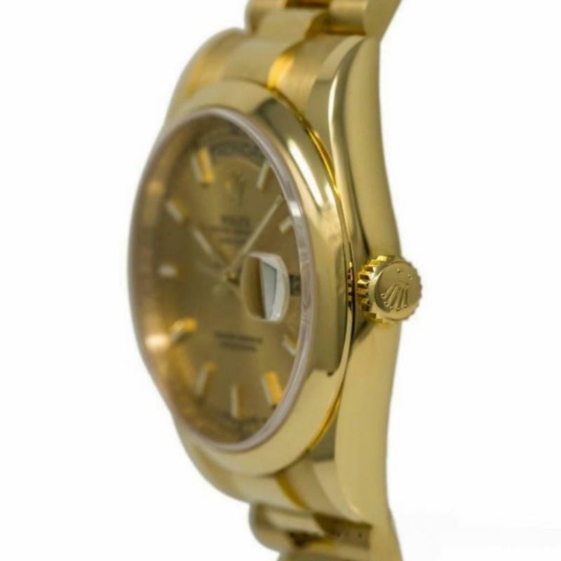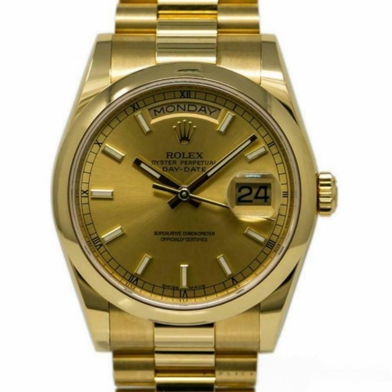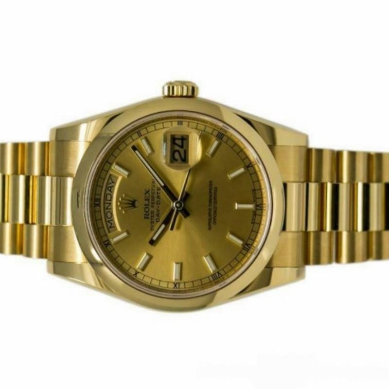 Rolex Day-Date 118208 unisex replica watch in yellow gold with 36 mm champagne dial. 36mm yellow gold case with yellow gold Rolex President bracelet. Fixed yellow gold domed bezel. Champagne-colored dial with hourly indexes. Minute markers around the outer edge. Date display at 3. Viewing the day of the week centered at 12. Scratch resistant sapphire crystal. Screw-down crown. Solid caseback. Round box.