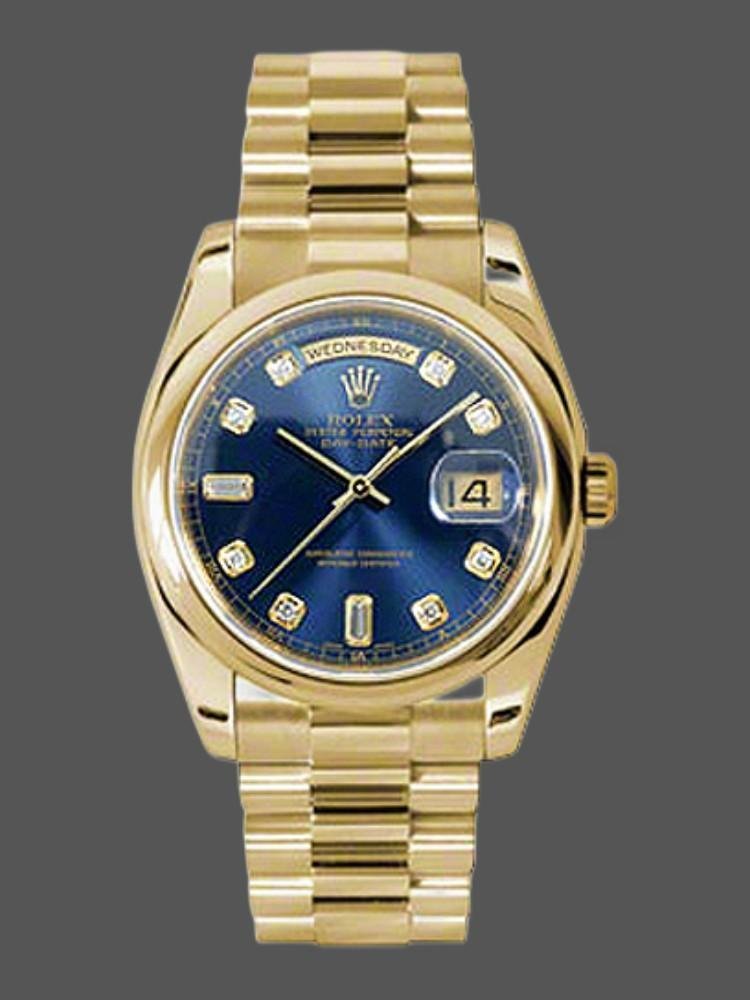 The Rolex Day-Date 118208, unisex yellow gold replica with blue dial and 36mm diamonds, features a round 36mm yellow gold case with screw-down crown and yellow gold bezel. This Day-Date features an attractive blue dial with diamond markers. The reliable yellow gold President bracelet will look great on your wrist.