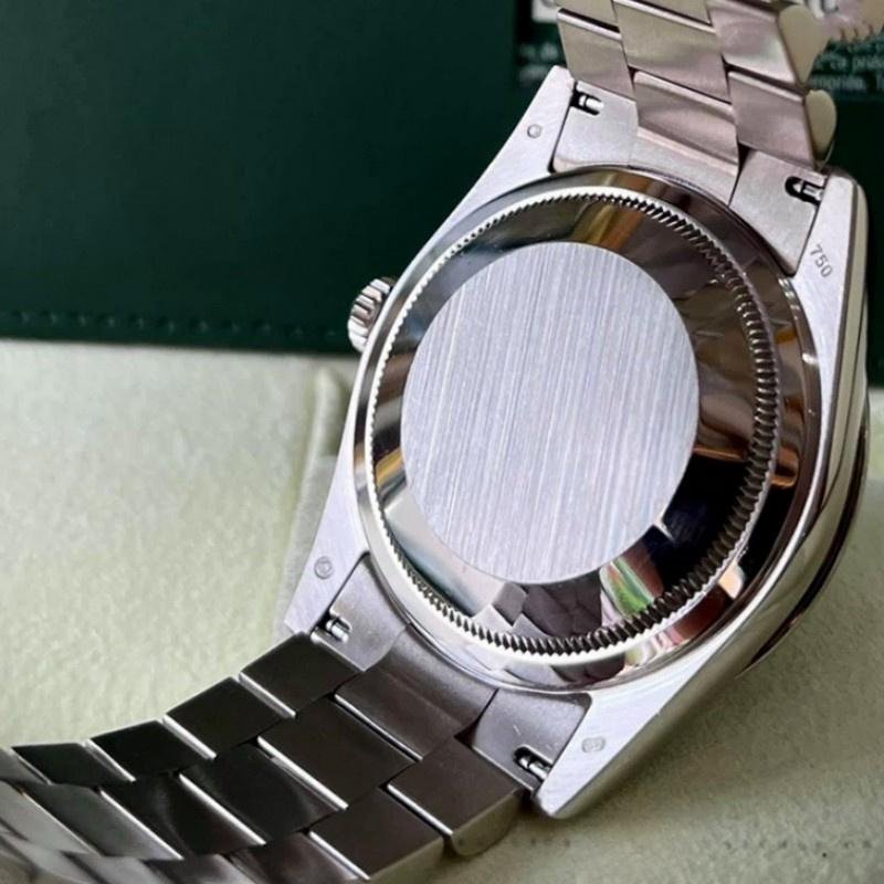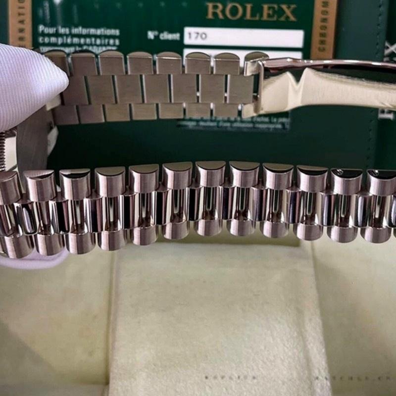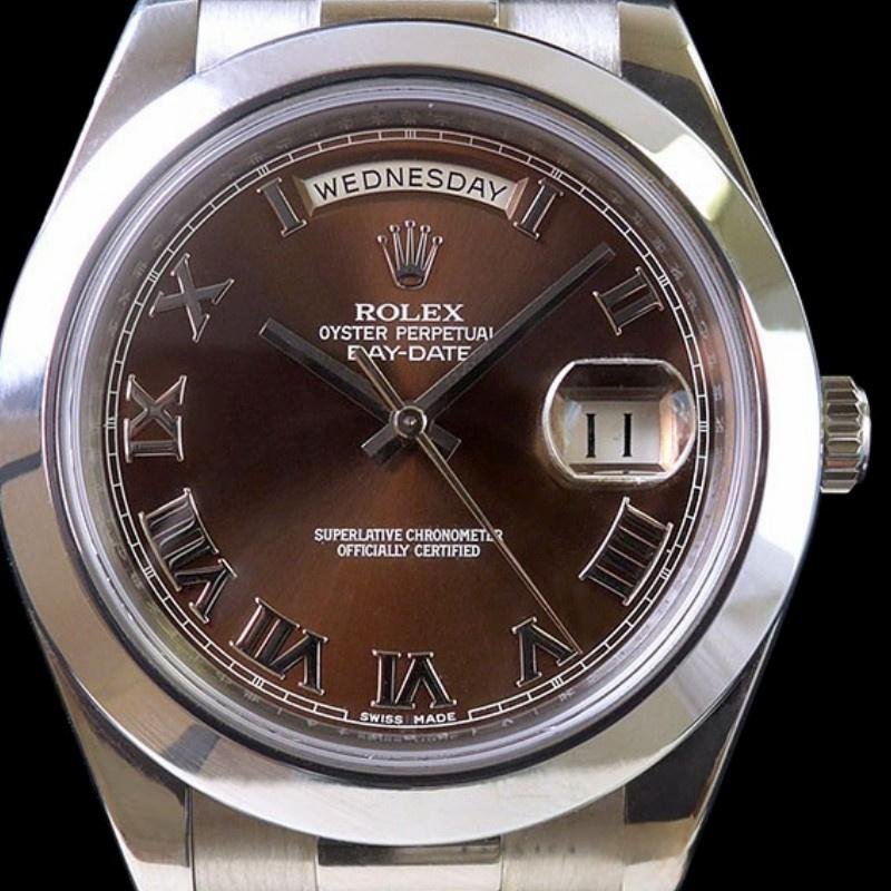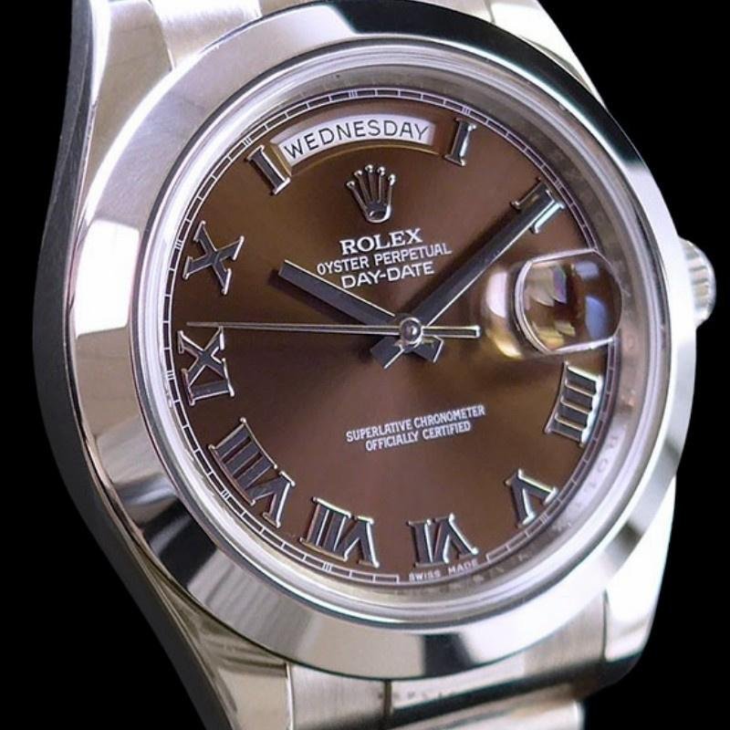 Rolex Day-Date 118209 unisex replica watch in white gold with 36 mm chocolate brown dial. 36mm white gold case. Chocolate brown dial with Roman numerals, manufacturer’s serial numbers and minute markers on the outer edge. Date display at 3. Polished bezel, white gold domed bezel and Oyster bracelet. Scratch-resistant sapphire crystal.