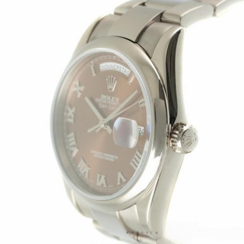 Rolex Day-Date 118209 watch in white gold, copper brown dial, 36 mm, unisex replica. 36mm white gold case. Chocolate brown dial with Roman numerals, manufacturer’s serial numbers and minute markers on the outer edge. Date display at 3. Polished bezel, white gold domed bezel and Oyster bracelet. Scratch-resistant sapphire crystal.