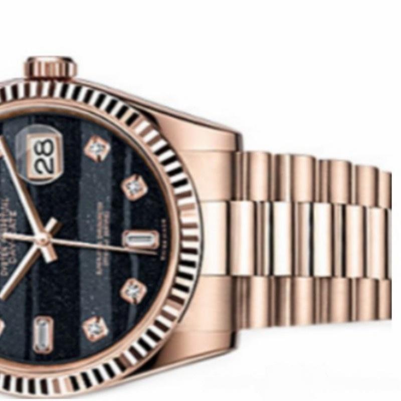 The Rolex Day-Date 118235 Everose Gold Diamond Ferrite Dial 36mm, unisex replica, features a 36mm diameter round rose gold case with solid bottom, sapphire crystal and yellow gold fluted bezel. The black ferrite dial features 8 round and 2 baguette diamond hour markers, plus an instant date window at 3 and the day at 12. Includes a rose gold three-piece presidential link bracelet, with a hidden folding crown clasp that integrates seamlessly with the bracelet.